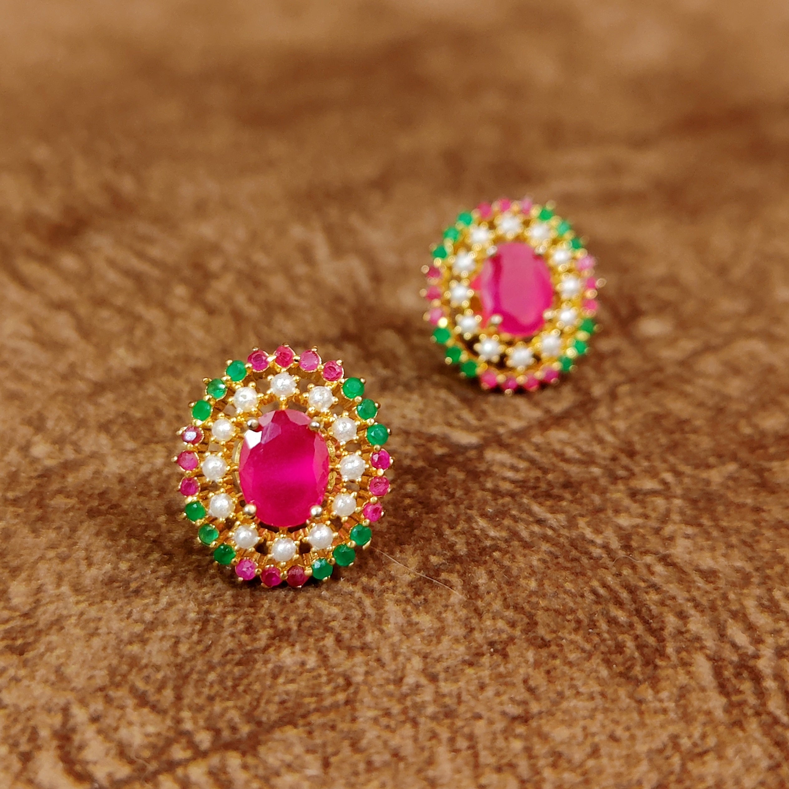 Shimmer your way through your day with our multicolour colour cz studded round studs! Featuring a stunning combination of pearl stones, complimented by sparkling ruby & emerald colour cz stone accents. These light-weight, gold plated earrings are perfect for daily wear. So go ahead, add a pop of color to your outfit and let your inner beauty shine!