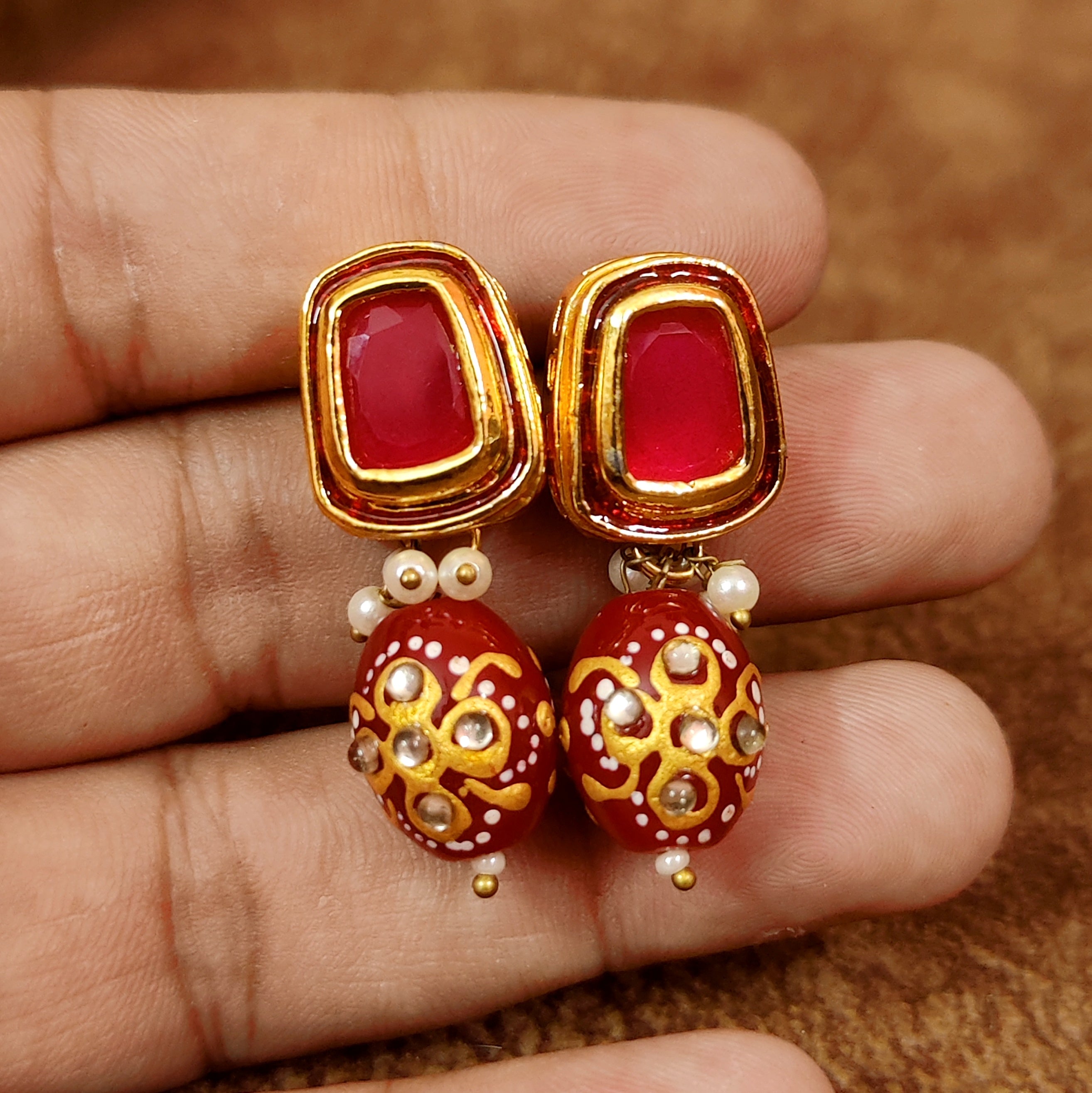 RUBY KUNDAN MEENAKARI GOLD PLATED DANGLING STUDS