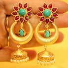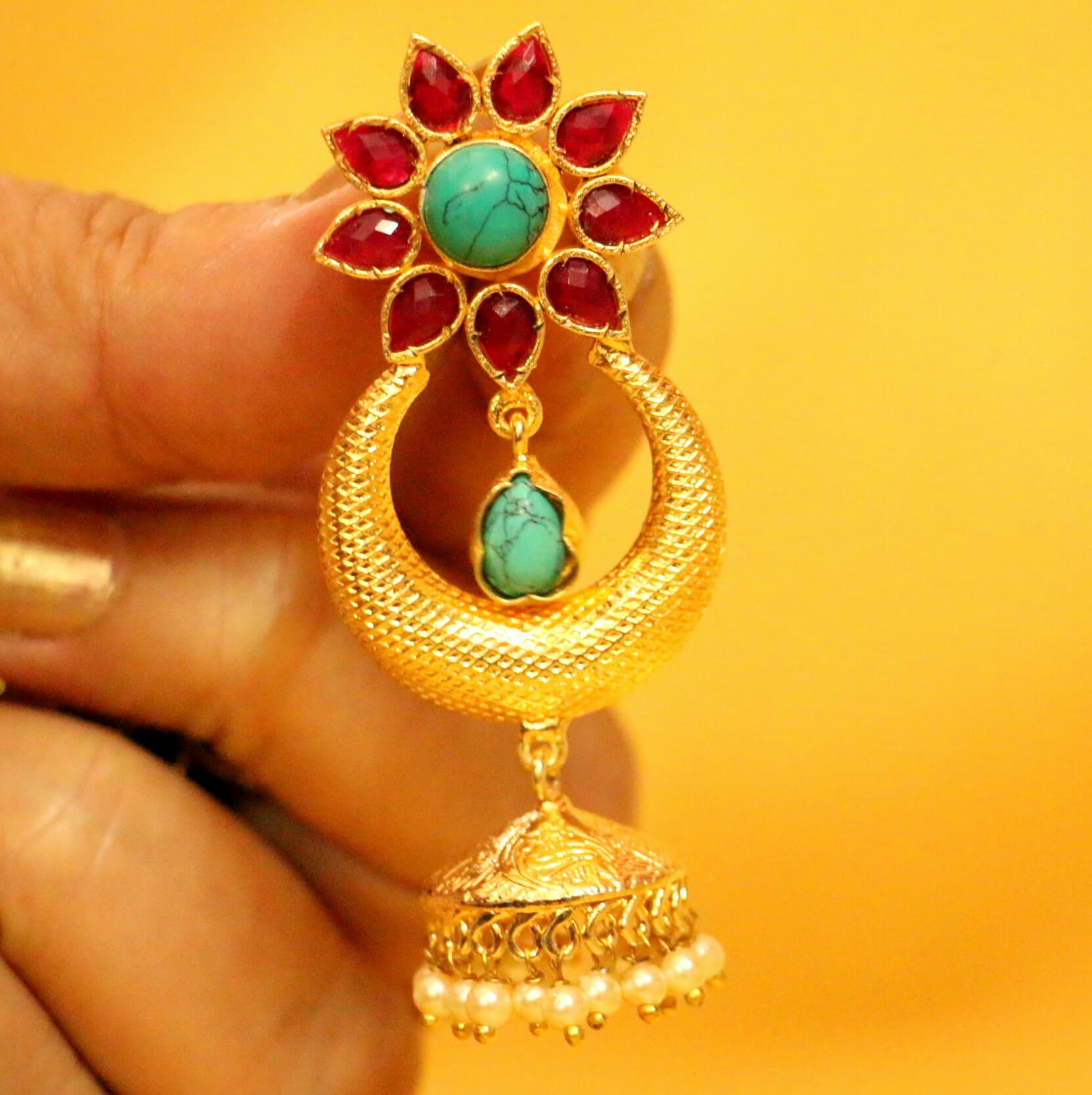 These beautiful earrings are handcrafted in copper alloy with imitation semi precious pearls,ruby & polki work of very fine quality. These earrings are coated with 18 kt gold polish which give them a unique look . An absolutely stunning piece to own and are very light in weight.