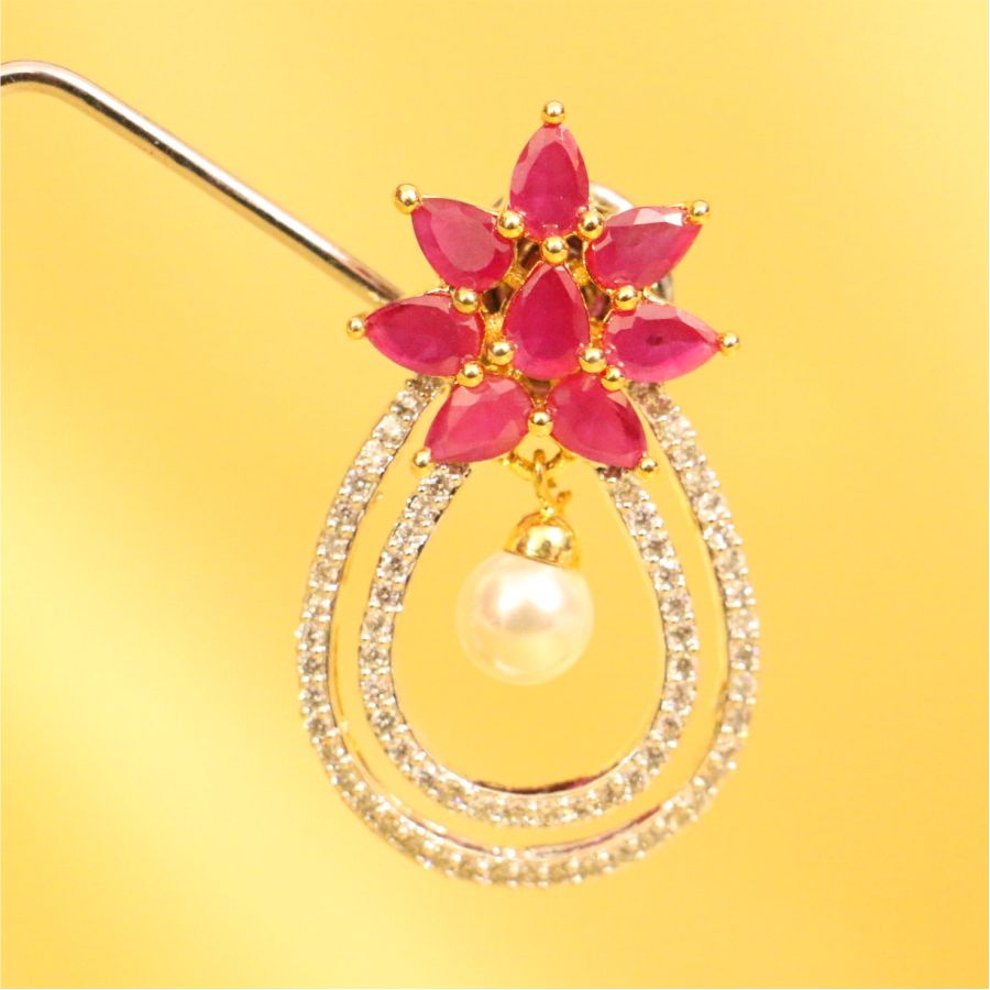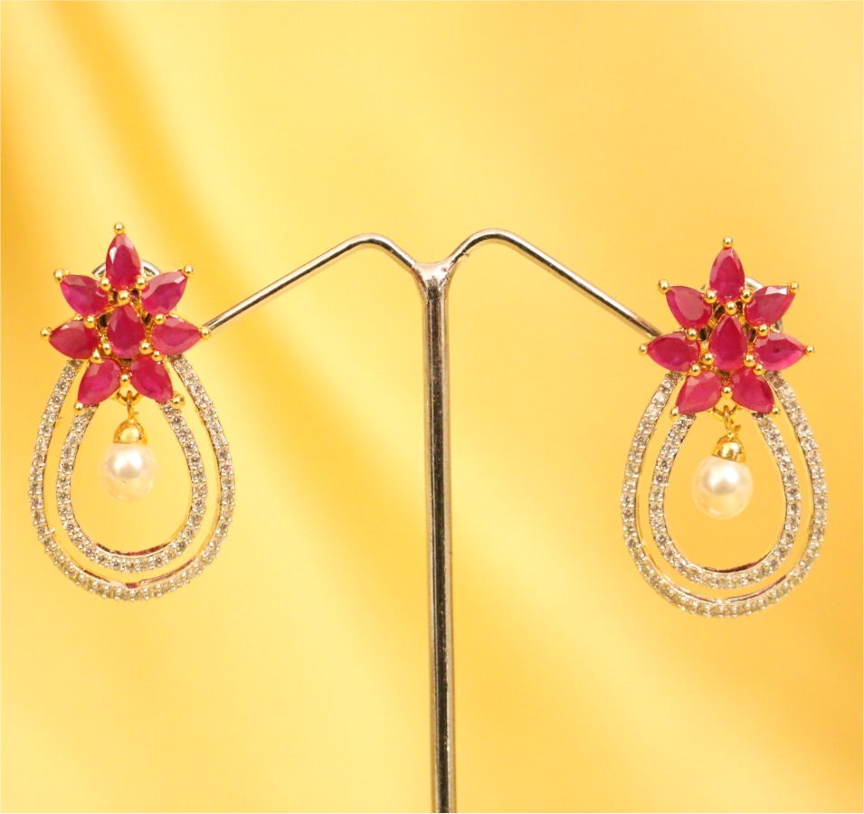 These beautiful Earrings are handcrafted in silver alloy with imitation American diamond,Pearl and semi precious stones of very fine quality. These earrings are coated with 18 kt gold polish which give them a unique look . An absolutely stunning piece to own and are very light in weight.