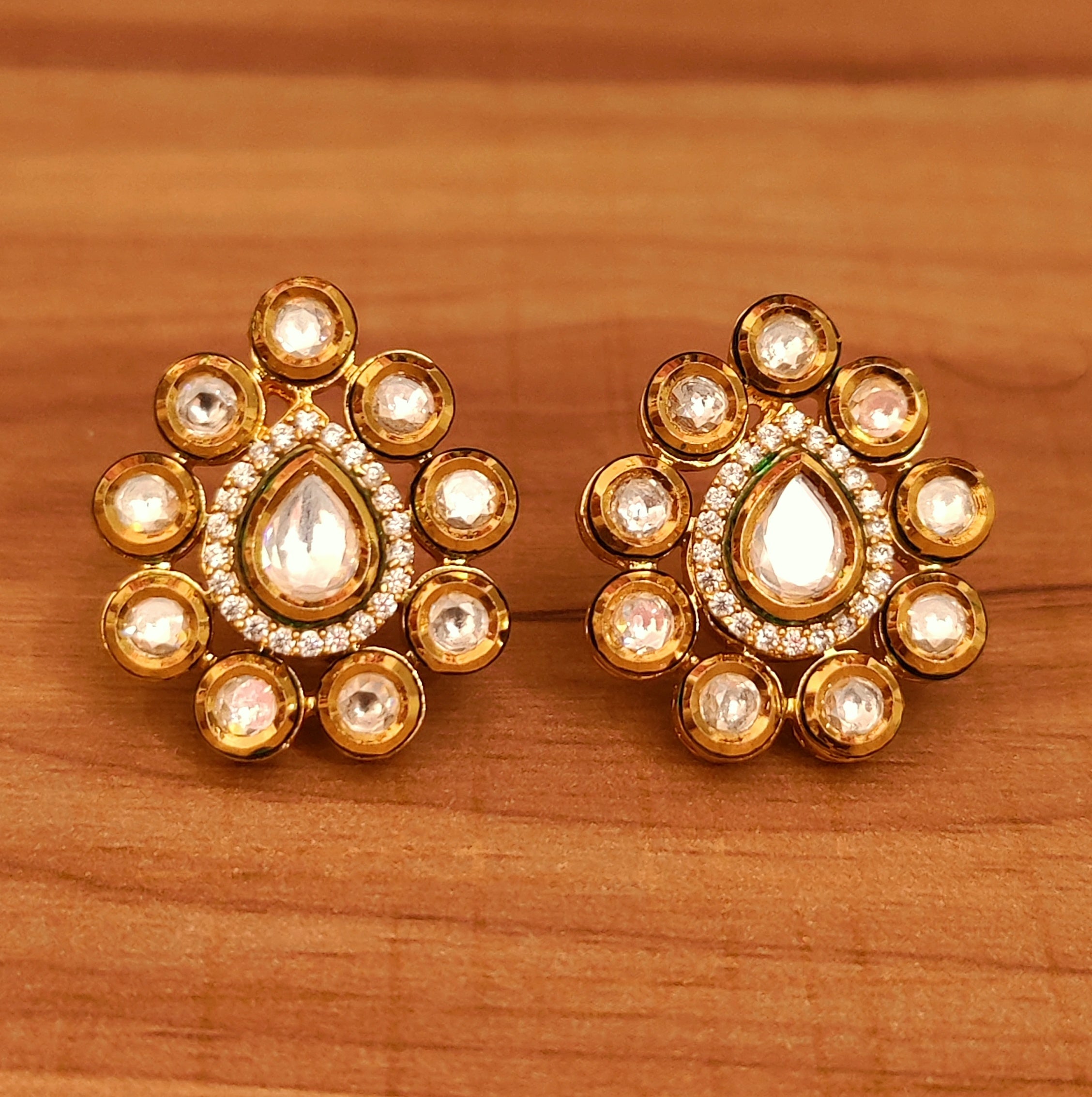 These beautiful studs are handcrafted in brass alloy with imitation cz stone and kundan with meenakari work of very fine quality. these artistic yet modern earrings are plated with high quality gold rhodium. the earrings are very light in weight.