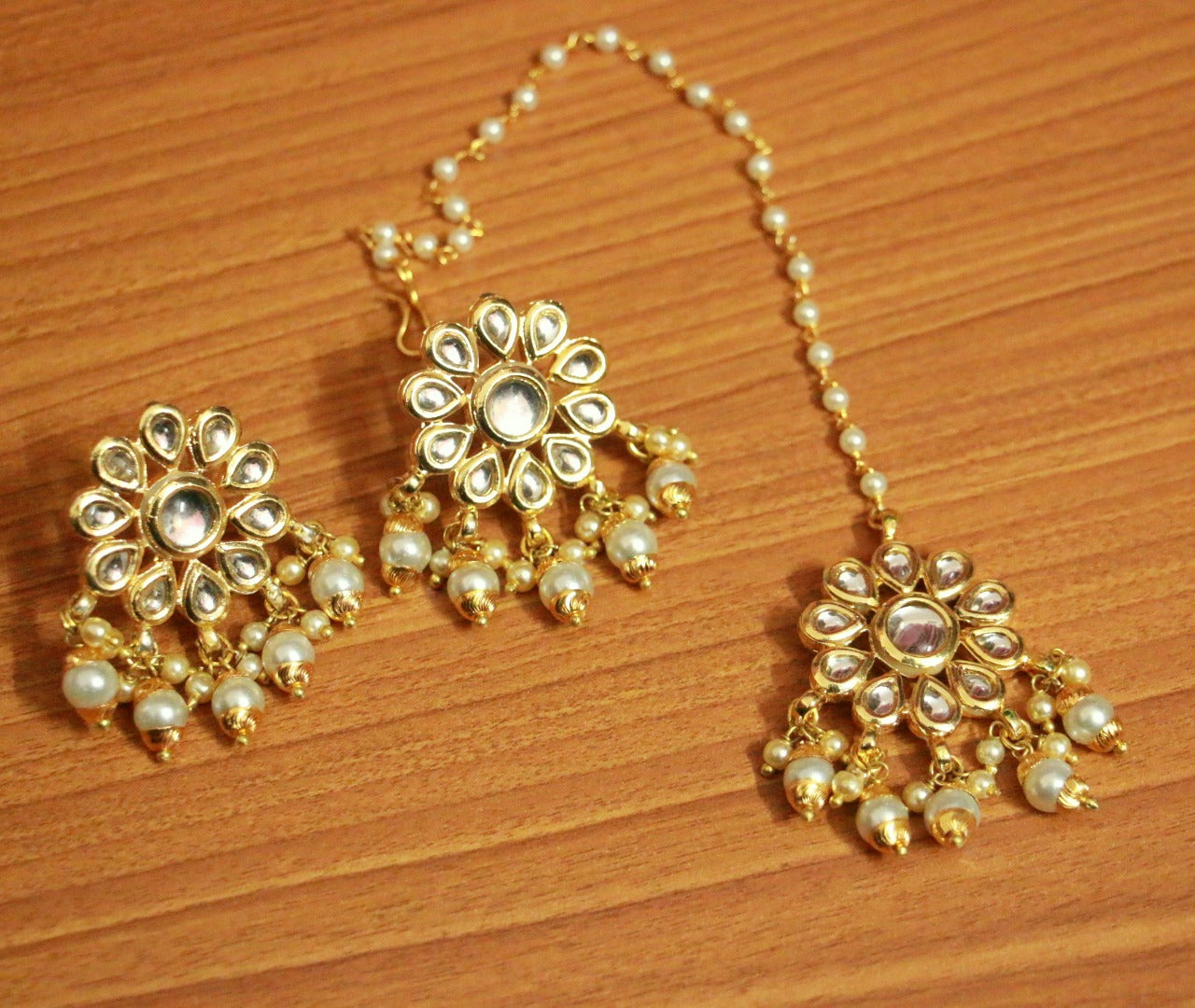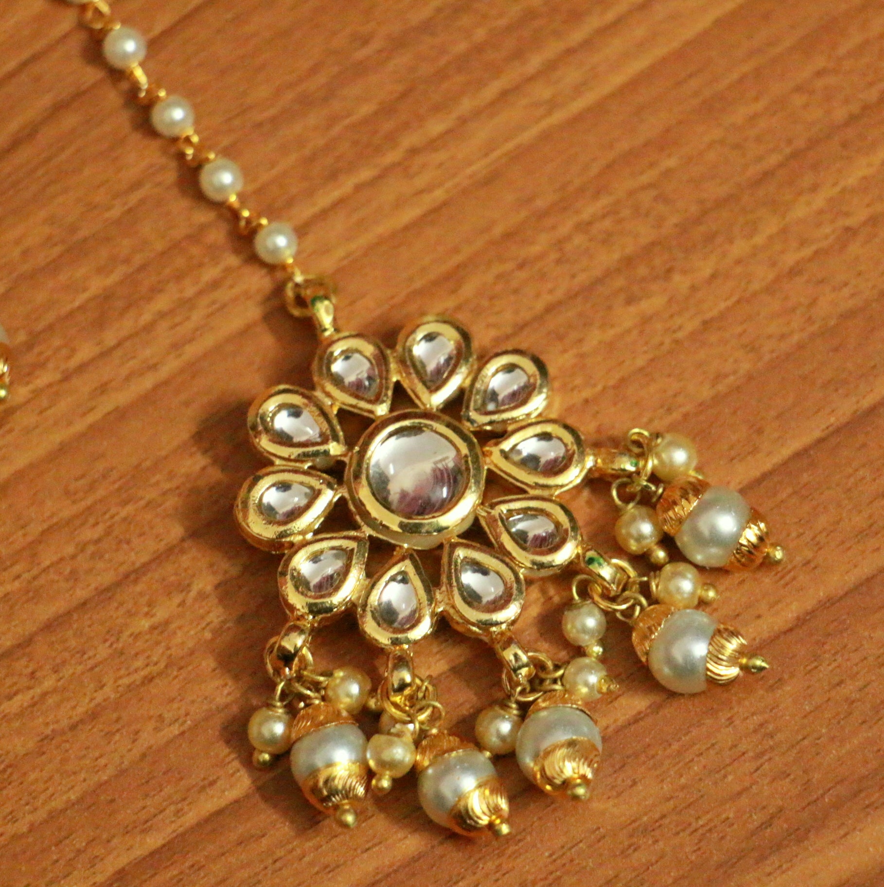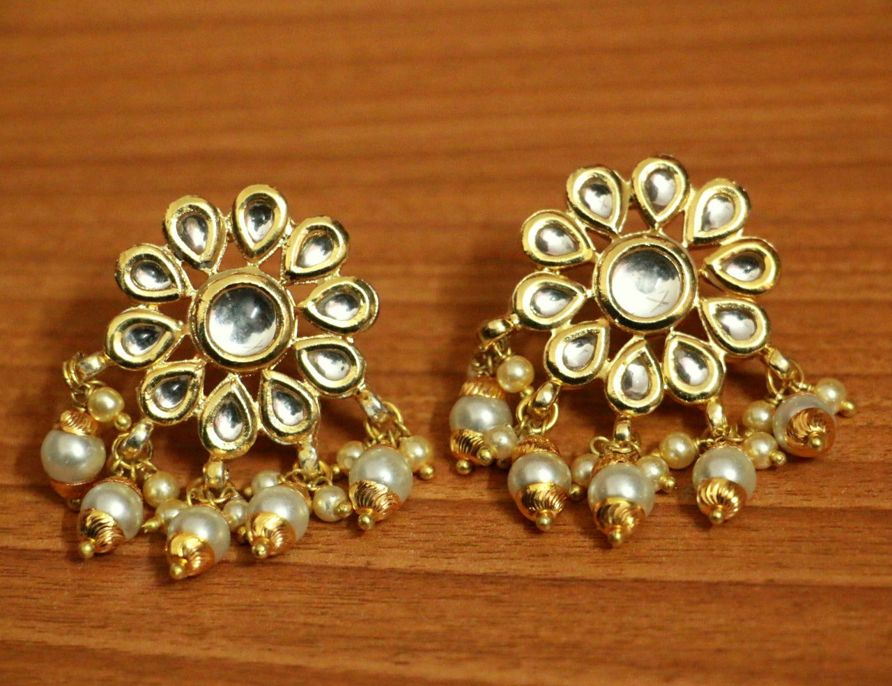 These kundan look danglers are handcrafted in silver alloy with pearls & imitation kundan stones . The earrings are plated in 18kt gold plating and are very light in weight