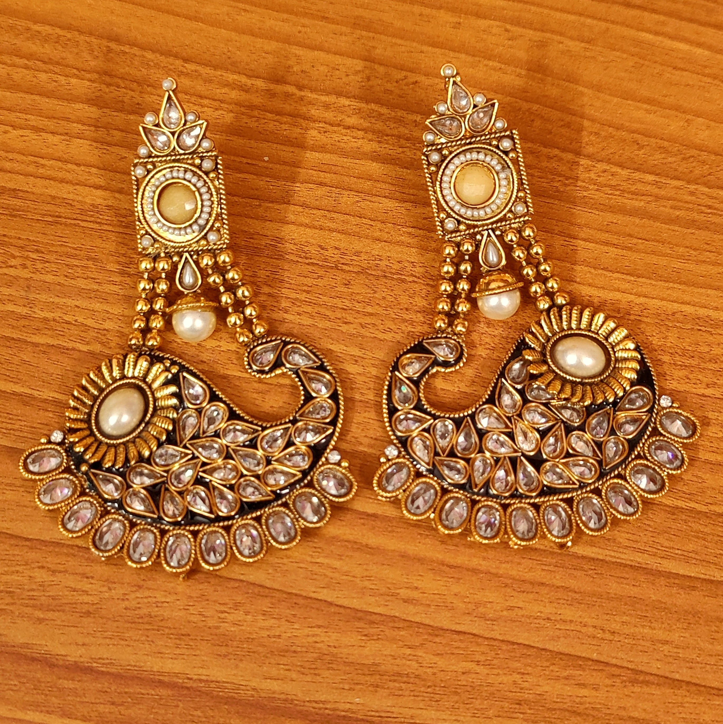 These gold plated earrings are handcrafted in silver alloy with imitation pearls and polki stones of very fine quality. These party wear long earrings are plated with 22kt antique gold plating which gives the design a real gold look , the earrings are light in weight and are perfect for occasional wear.