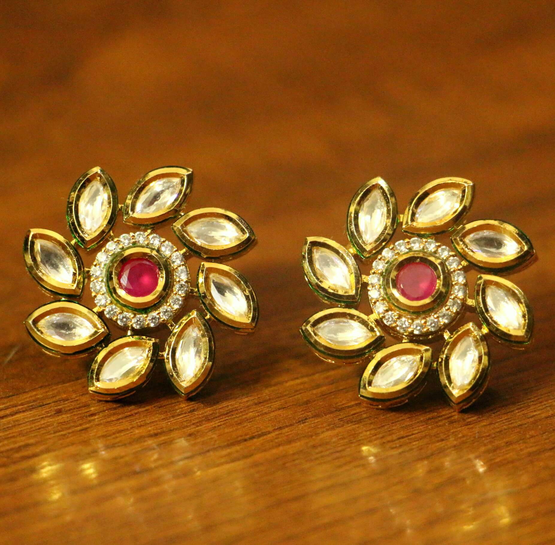 Red Kundan Ruby Yellow Gold Studs