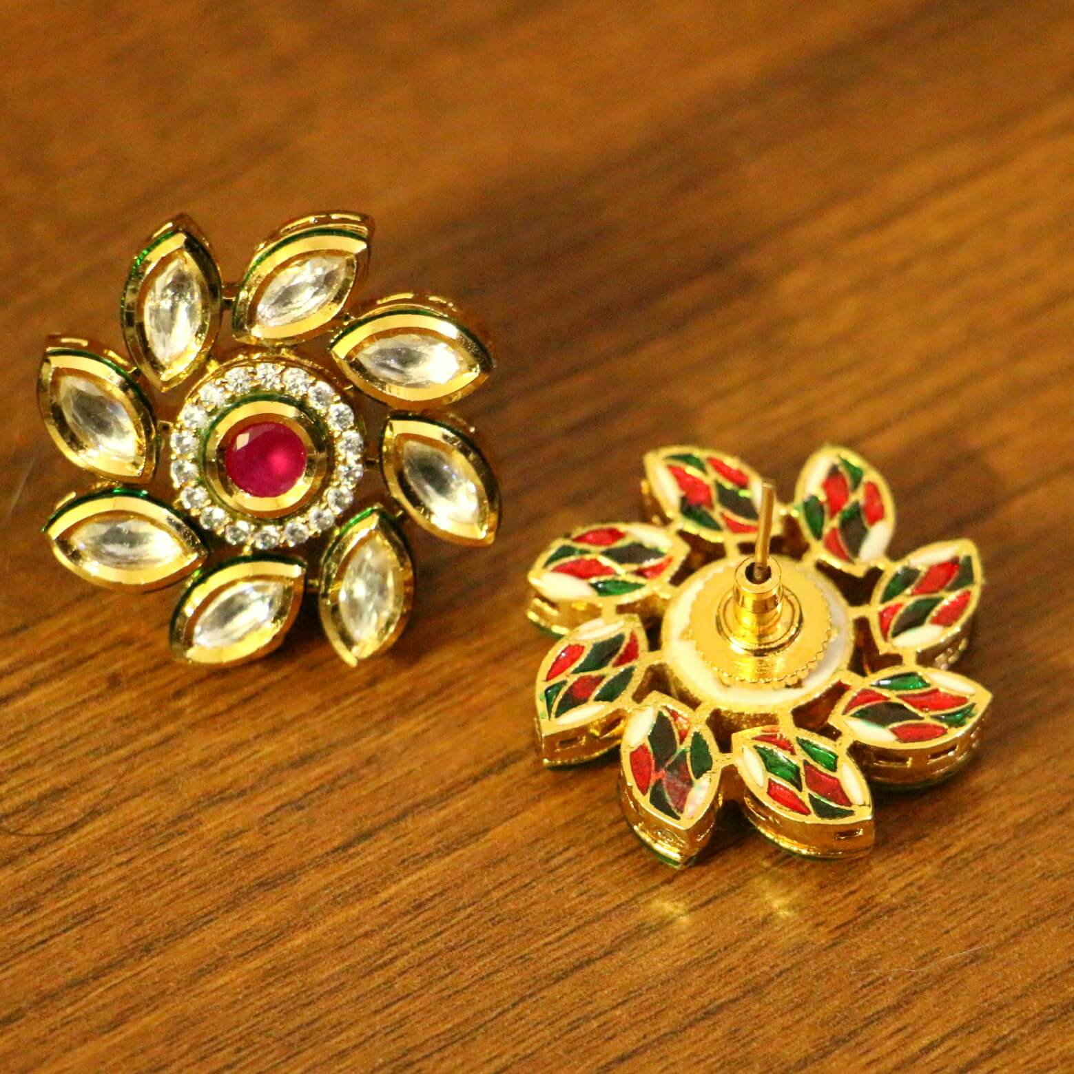 These beautiful earrings are handcrafted in brass alloy with imitation ruby,american diamond & kundan with meenakari work of very fine quality. These earrings are coated with 18 kt gold polish which give them a unique look . An absolutely stunning piece to own and are very light in weight.
