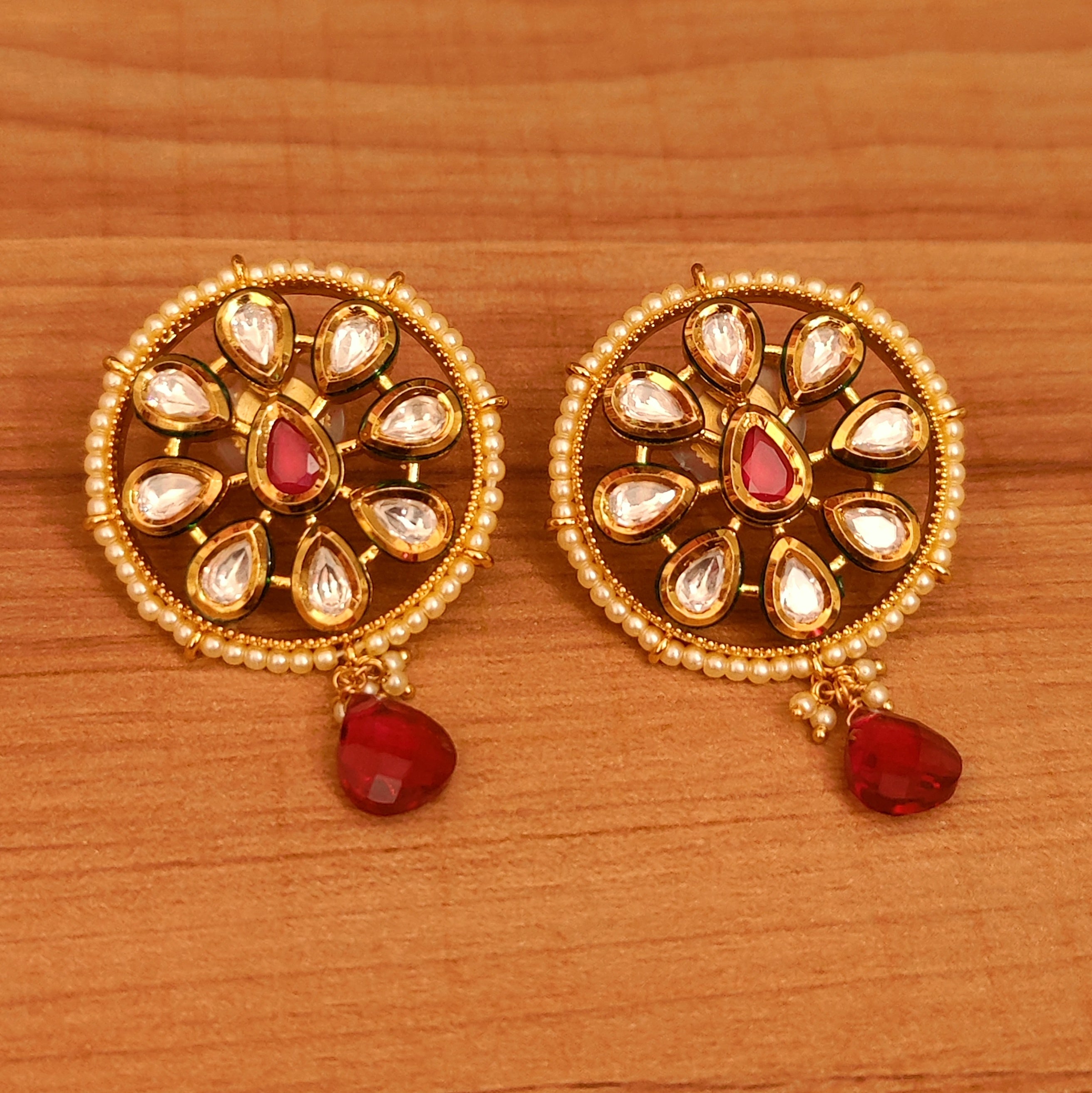 These beautiful studs are handcrafted in brass alloy with imitation red colour stone & pearls and kundan with meenakari work of very fine quality. these artistic yet modern earrings are plated with high quality gold rhodium. the earrings are very light in weight.