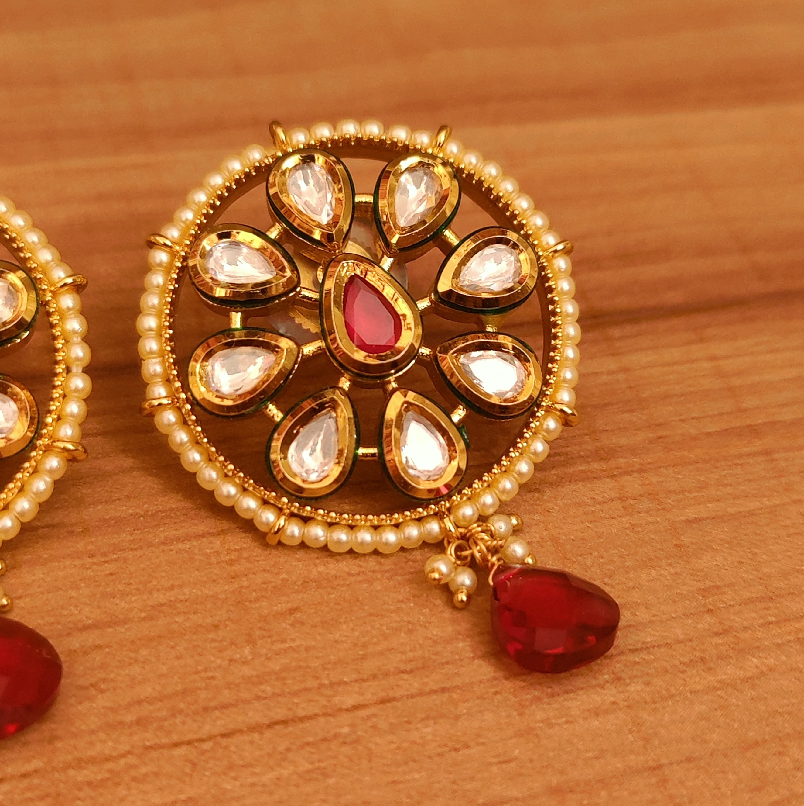 RUBY COLOUR KUNDAN MEENAKARI & PEARL BIG STUDS