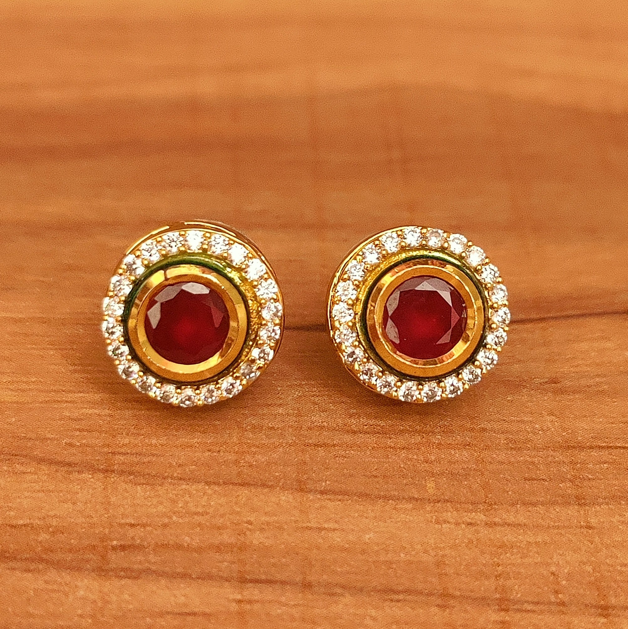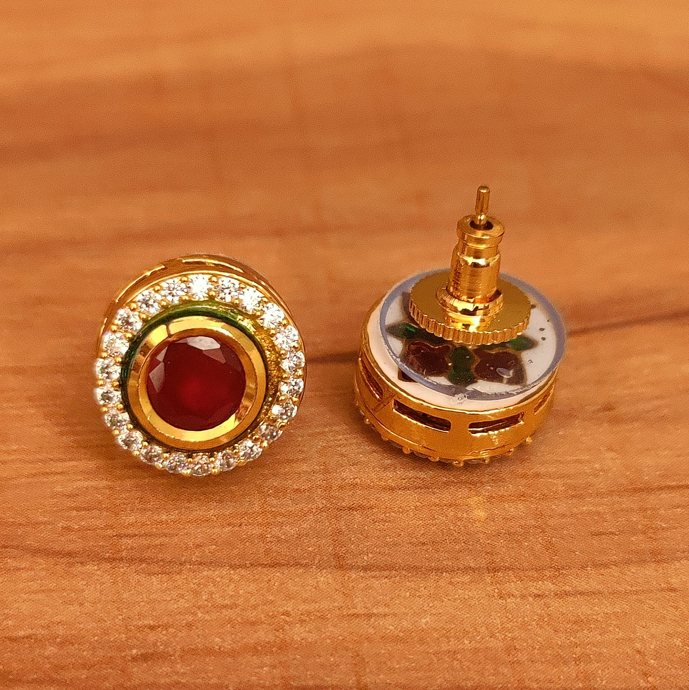 These beautiful studs are handcrafted in brass alloy with imitation red colour stone & cz stone and kundan with meenakari work of very fine quality. these artistic yet modern earrings are plated with high quality gold rhodium. the earrings are very light in weight.