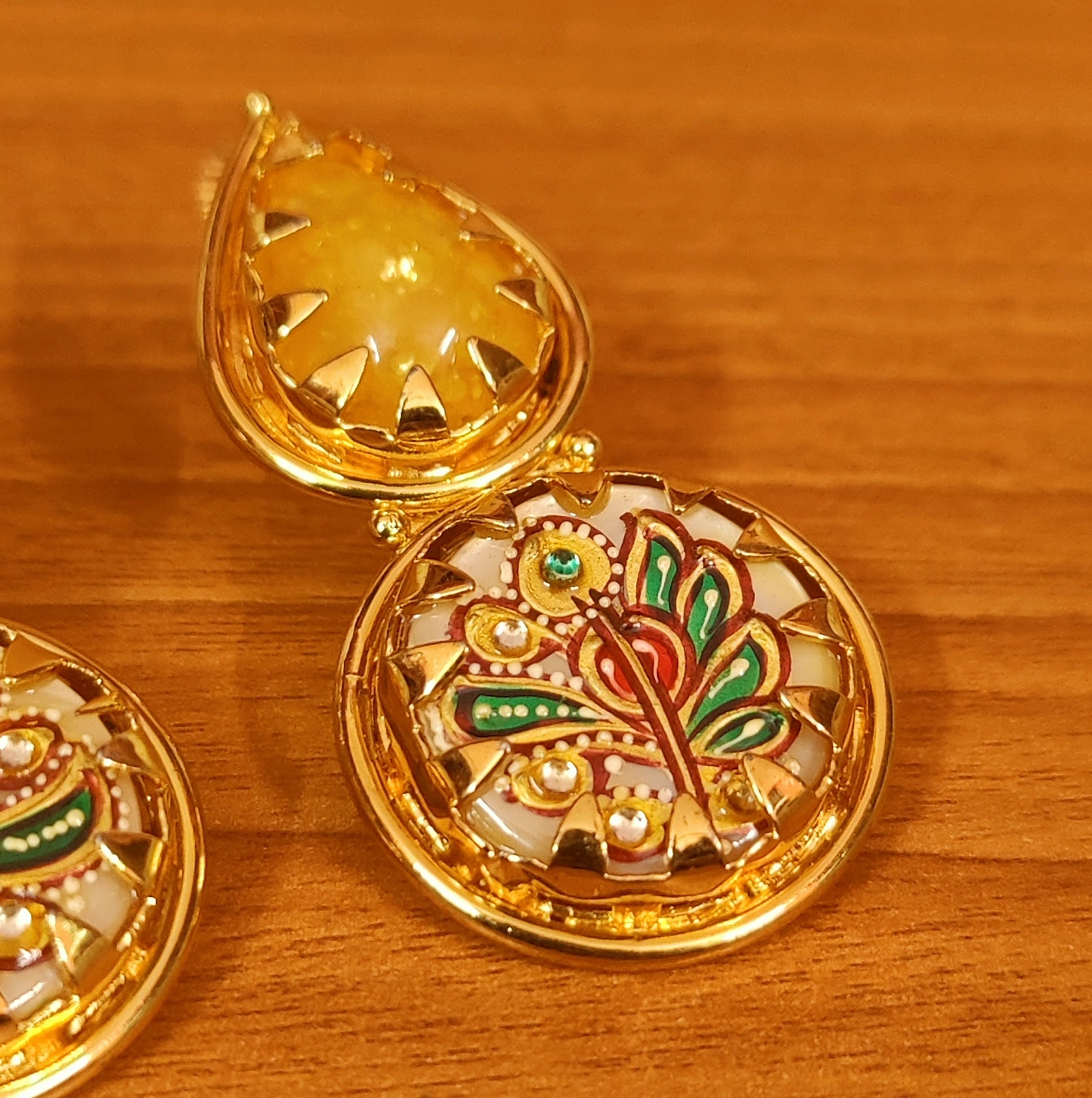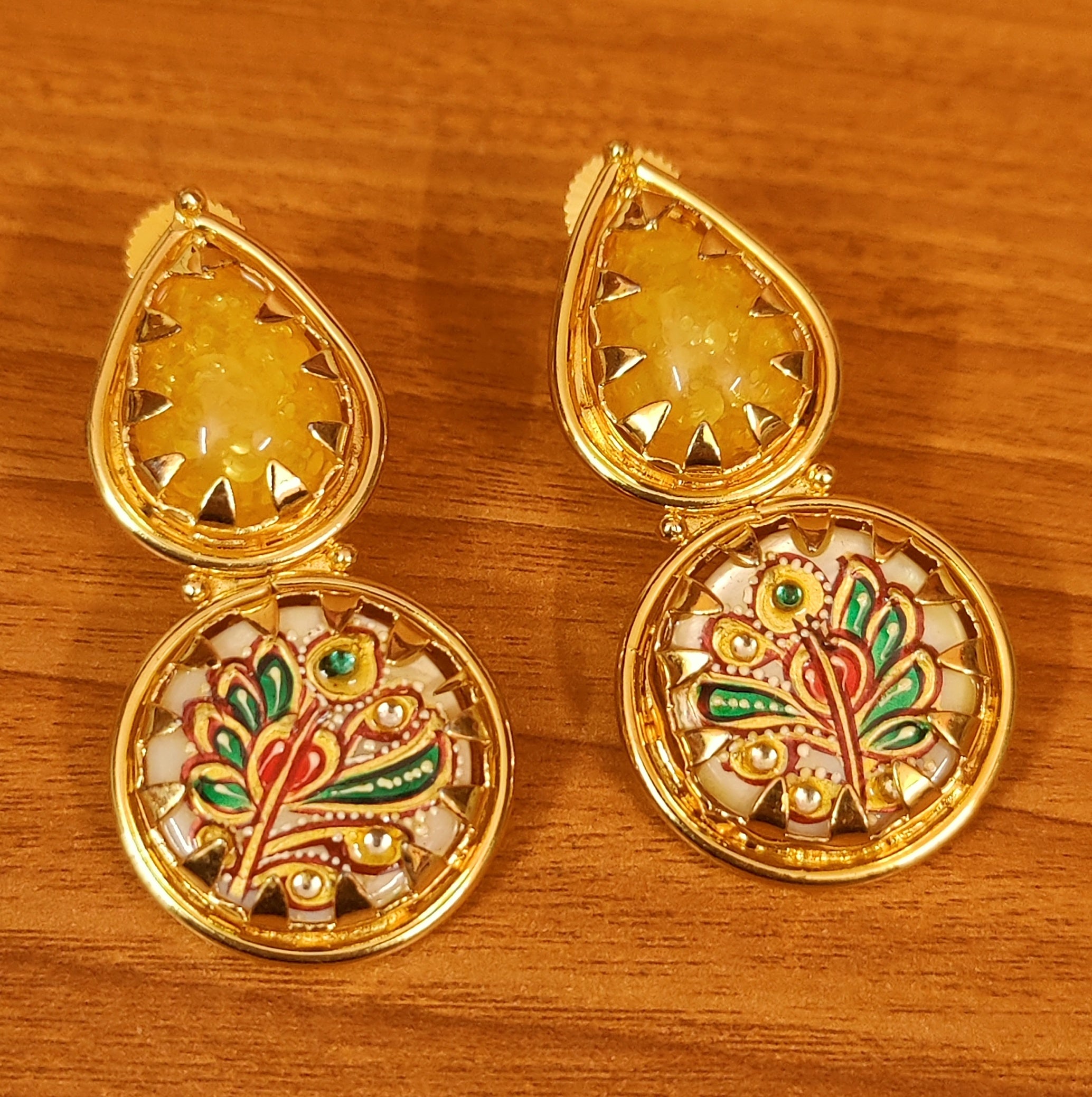 YELLOW QUARTZ GOLD PLATED HAND PAINTED EARRINGS