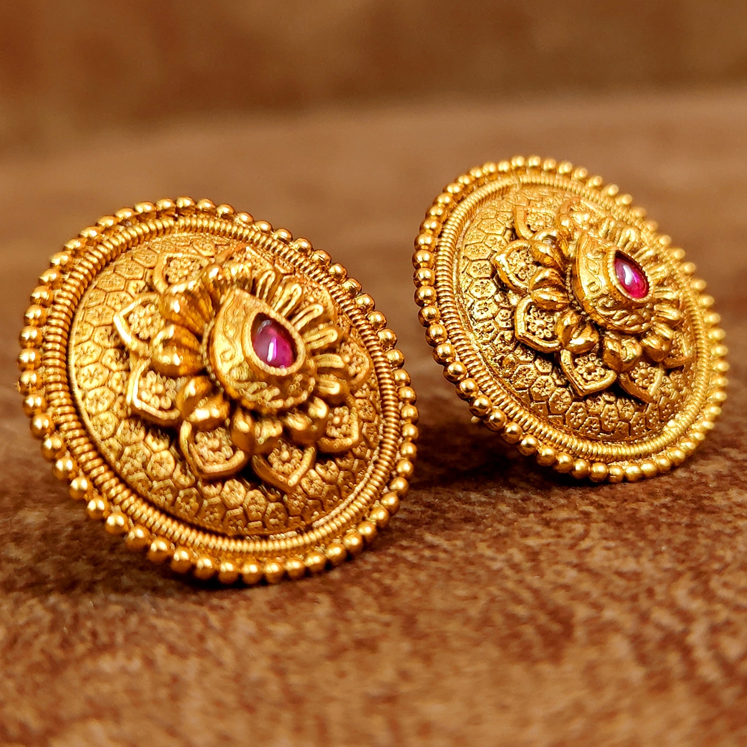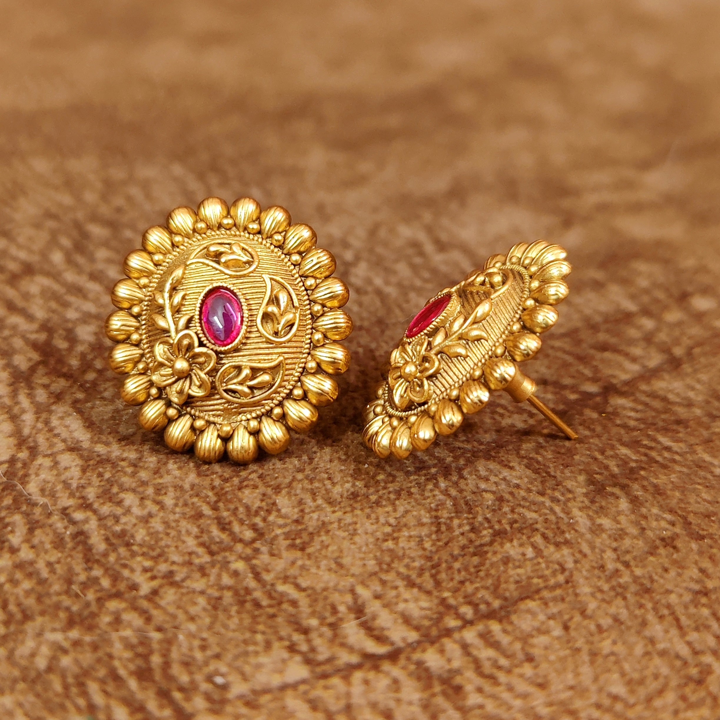 RUBY GOLD PLATED OVAL PATTERN FLORAL STUDS