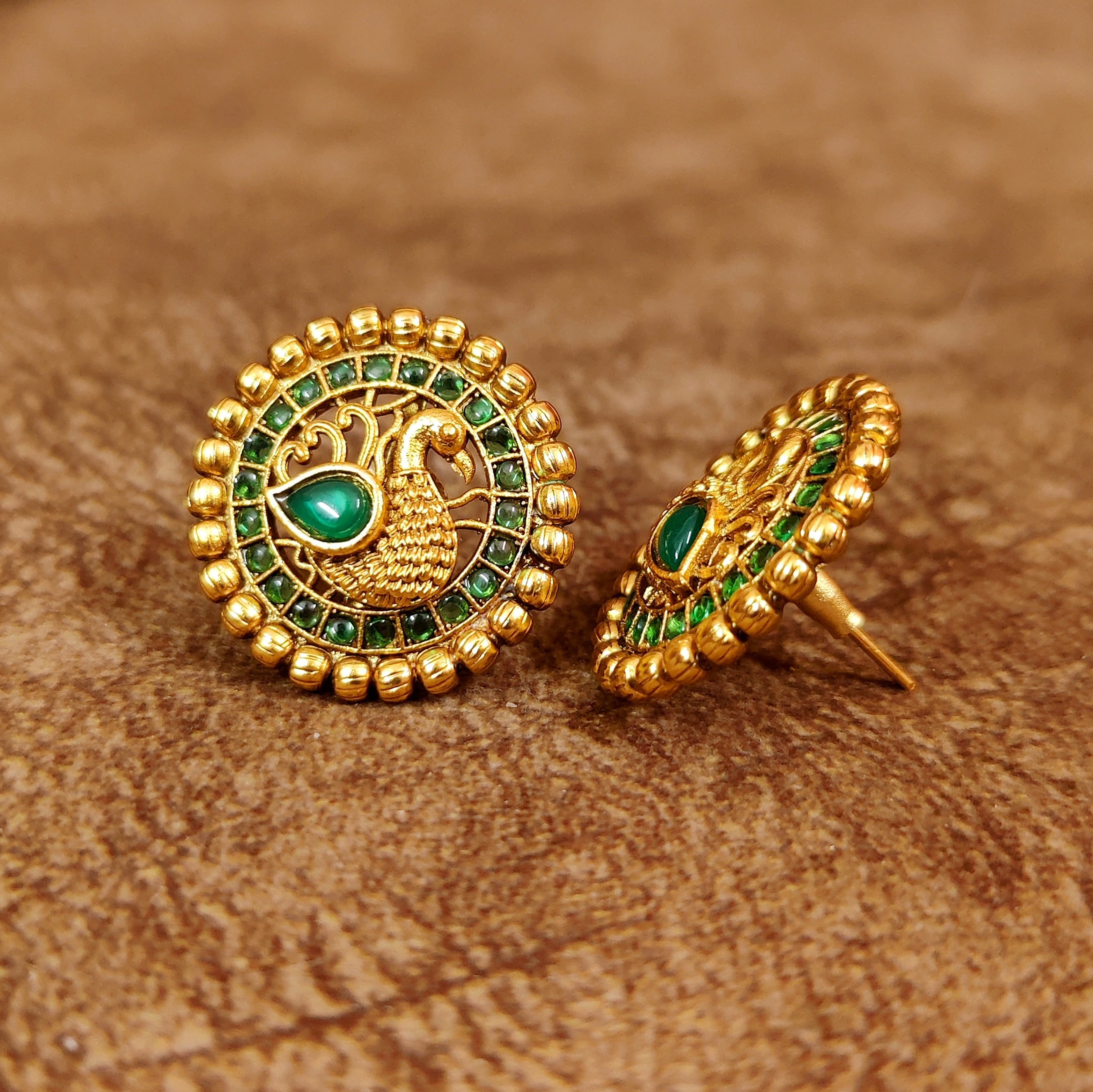 GREEN KEMPU STONE GOLD PLATED PEACOCK STUDS