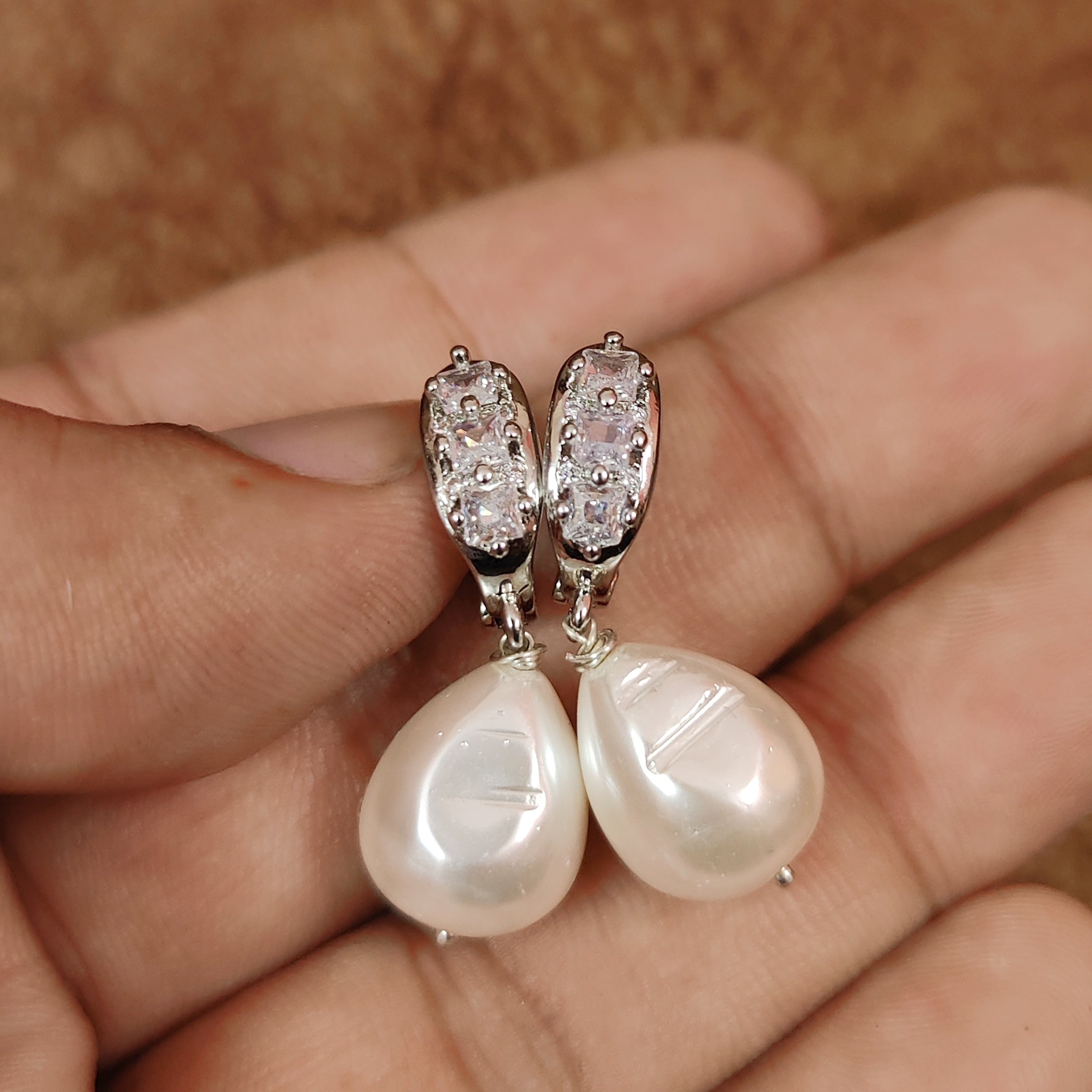 CZ STUDDED SILVER PLATED SHELL PEARL HOOPS