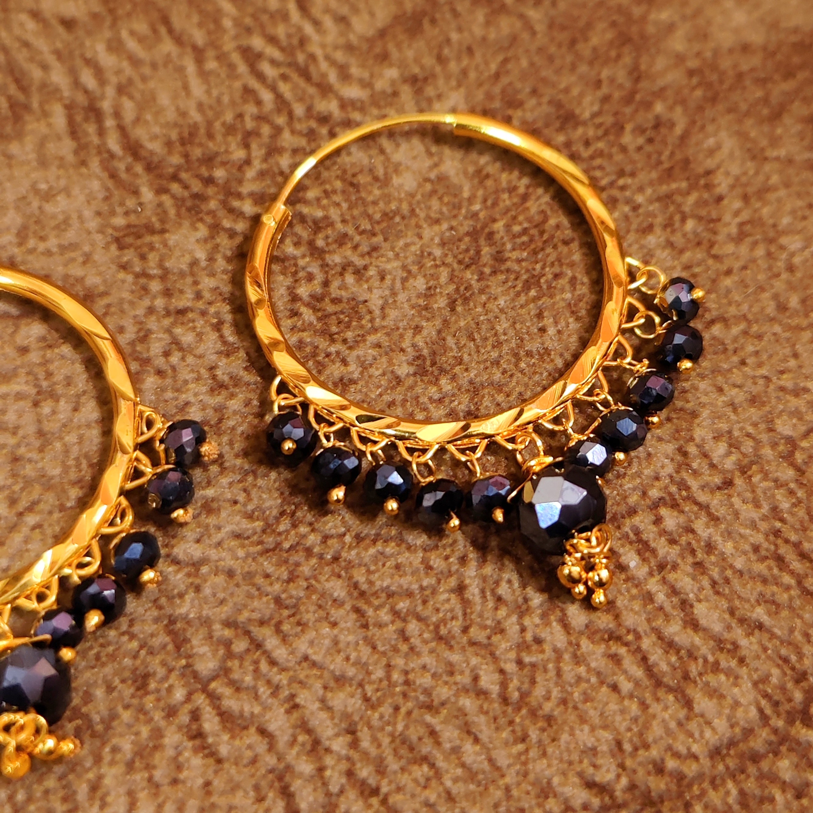 BLACK CRYSTAL GOLD PLATED DANGLING HOOPS