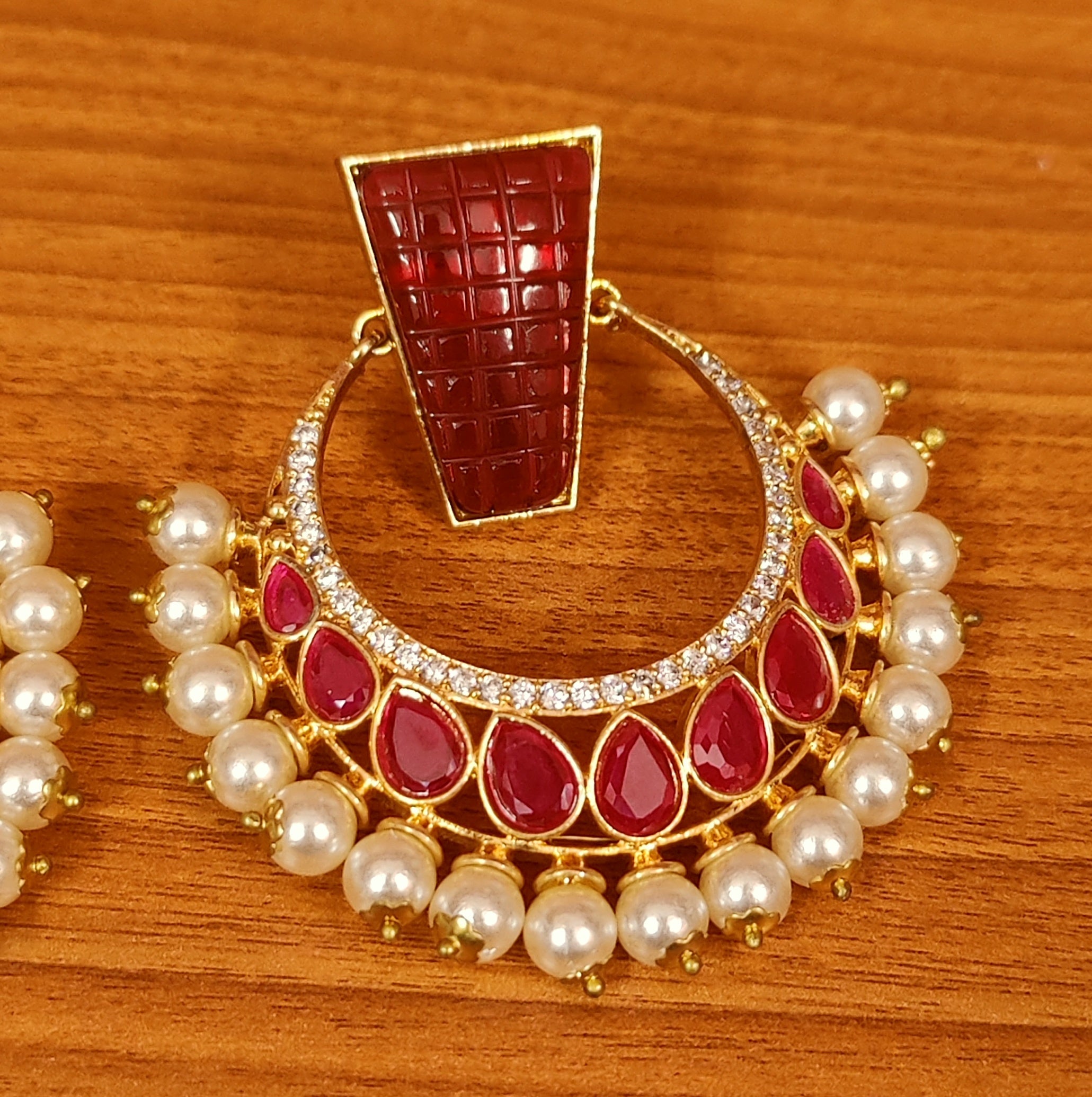 RUBY KUNDAN POLKI & CZ STUDDED PEARL CHANDBALI