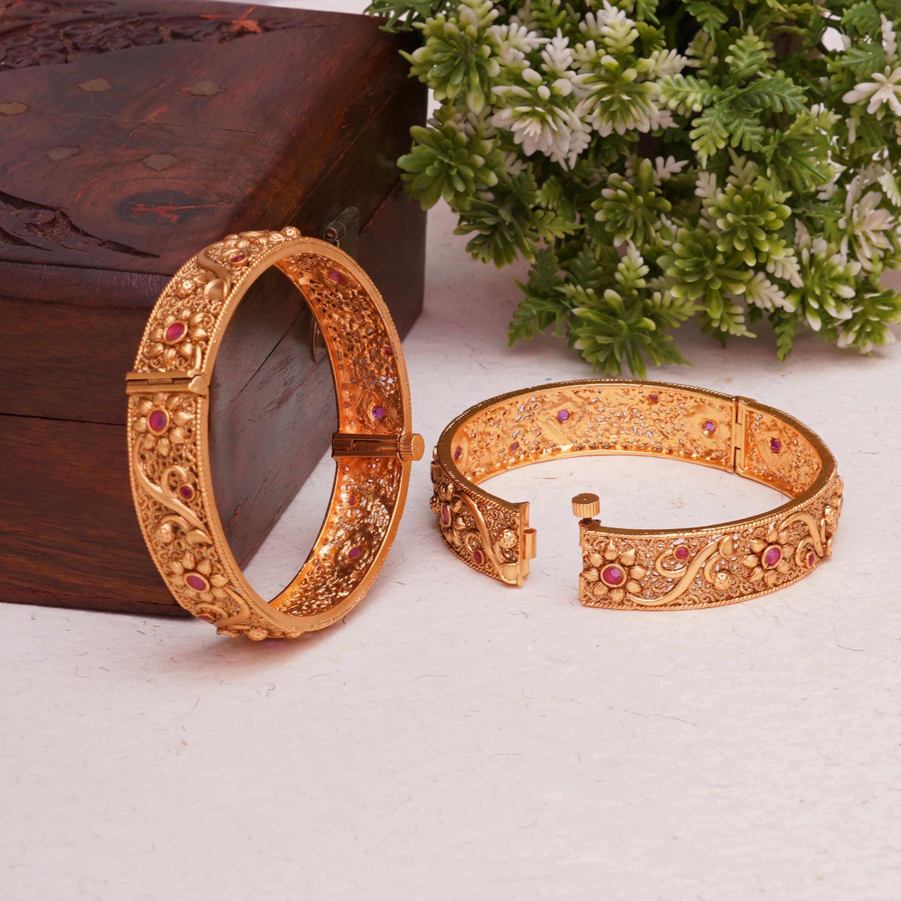 ANTIQUE MATT GOLD PLATED RUBY OPENABLE BANGLES