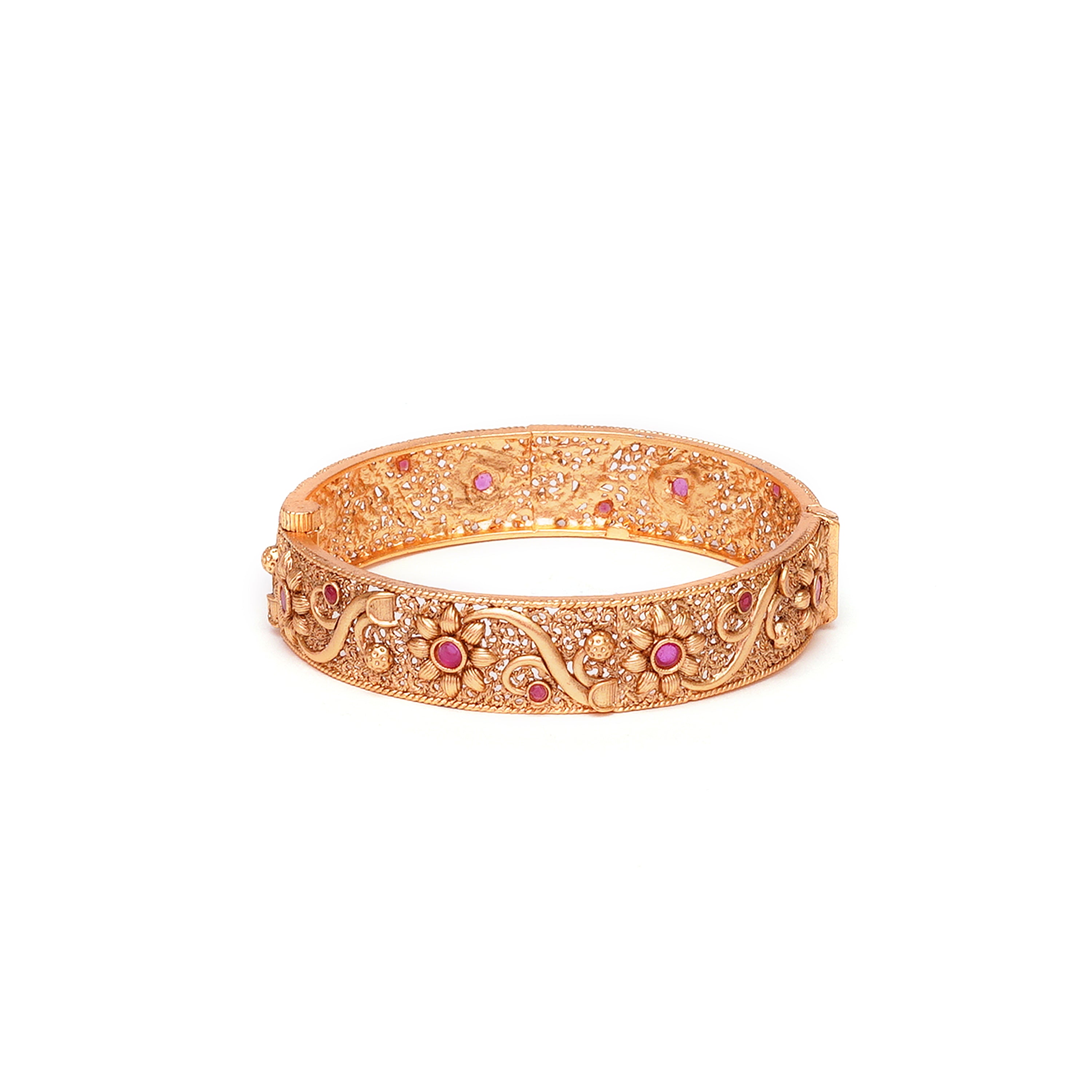 These openable bangles are handcrafted in copper alloy with imitation red colour stones of very fine quality. These artistic yet modern bangles are plated with fine nickle free matt gold rhodium to avoid any allergies to the skin.