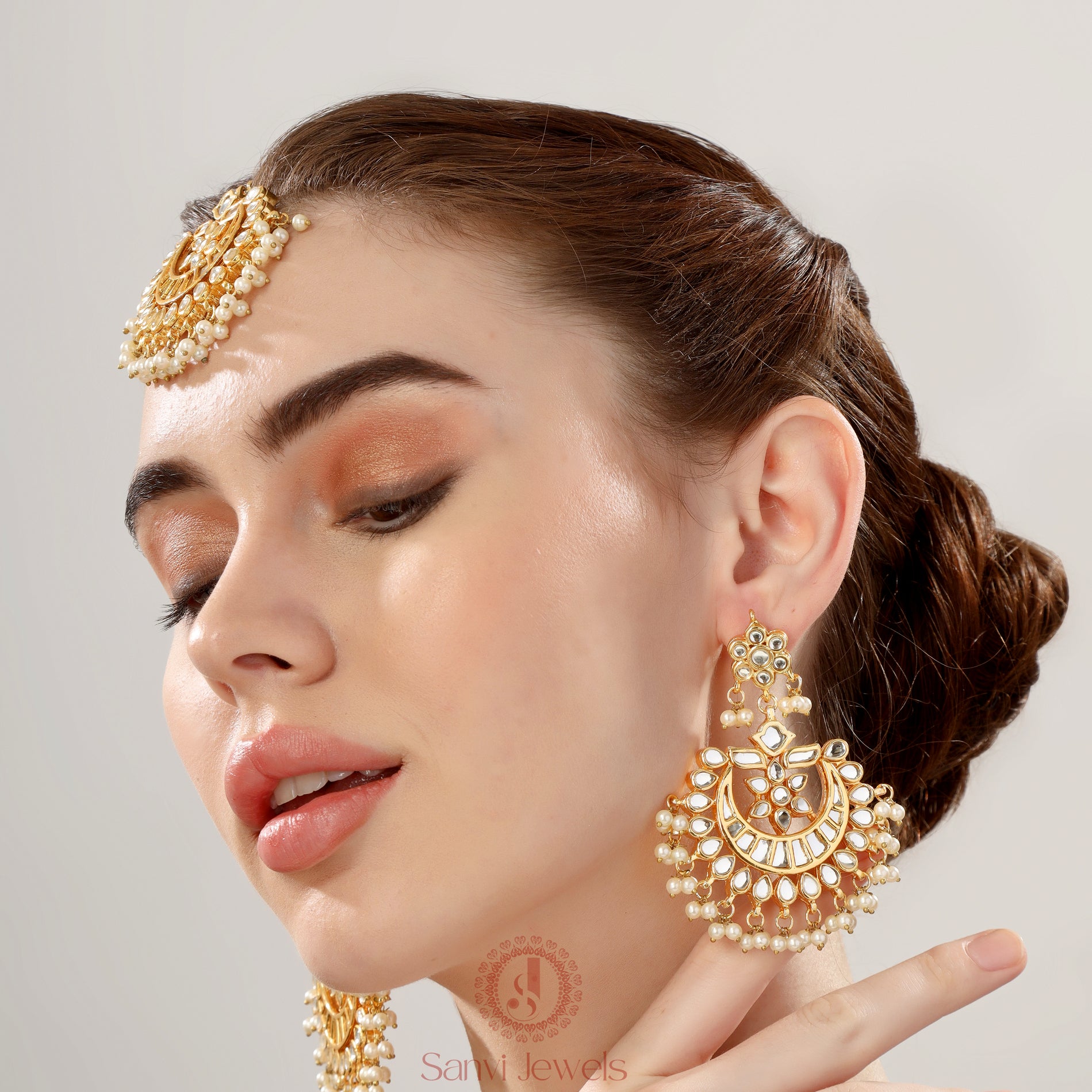 These Kundan Polki Earrings Are Handcrafted In Brass Alloy With Imitation Semi Precious Pearl Of Very Fine Quality. These Artistic Yet Modern Earrings Are Plated With High Quality Nickel Free Gold Rhodium. The Earrings Are Very Light In Weight.