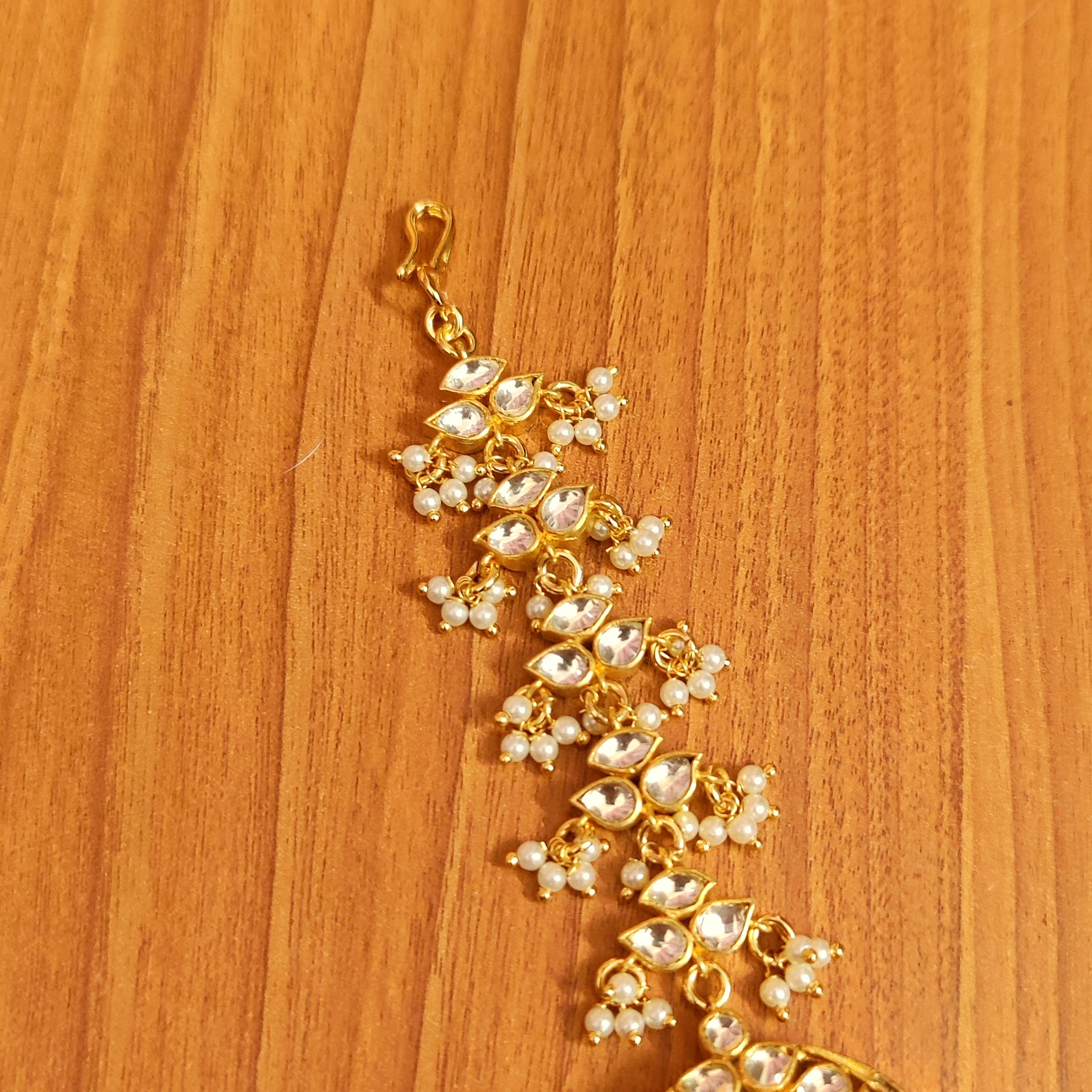 This beautiful bridal look mathapatti is handcrafted in copper alloy with minute & intricate gold work of very fine quality . This mathapatti is coated with 22 Kt matt gold plating which gives a very real look to the design . An absolutely gorgeous piece and is very light in weight.
