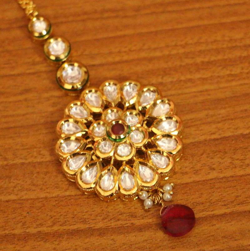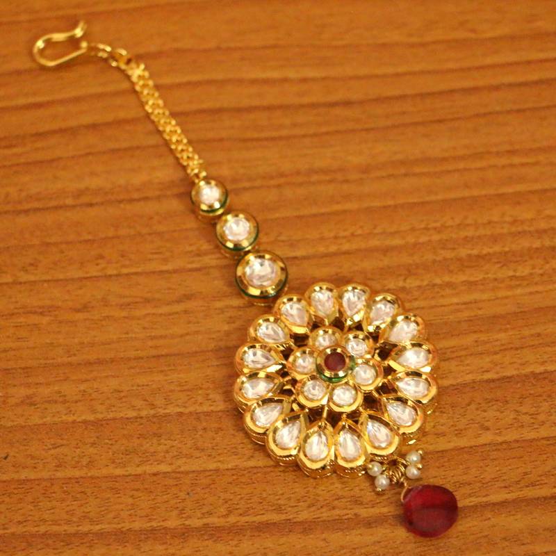 This Kundan Meenakari And Ruby Gold Look Maang Tikka Is Handcrafted In Brass Alloy With 18kt Fine Gold Plating And Pearl Of Fine Quality . This Maangtikka Is Very Light In Weight And Gives You A Real Gold Look. An Absolutely Stunning Piece To Own And Are Very Light In Weight.