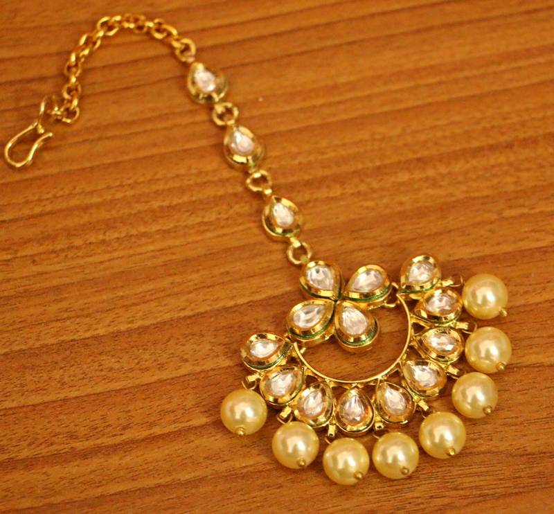 This Kundan Polki Maang Tikka Is Handcrafted In Brass Alloy With 18kt Fine Gold Plating And Pearl Of Fine Quality . This Maang Tikka Is Very Light In Weight And Gives You A Real Gold Look. An Absolutely Stunning Piece To Own And Are Very Light In Weight.