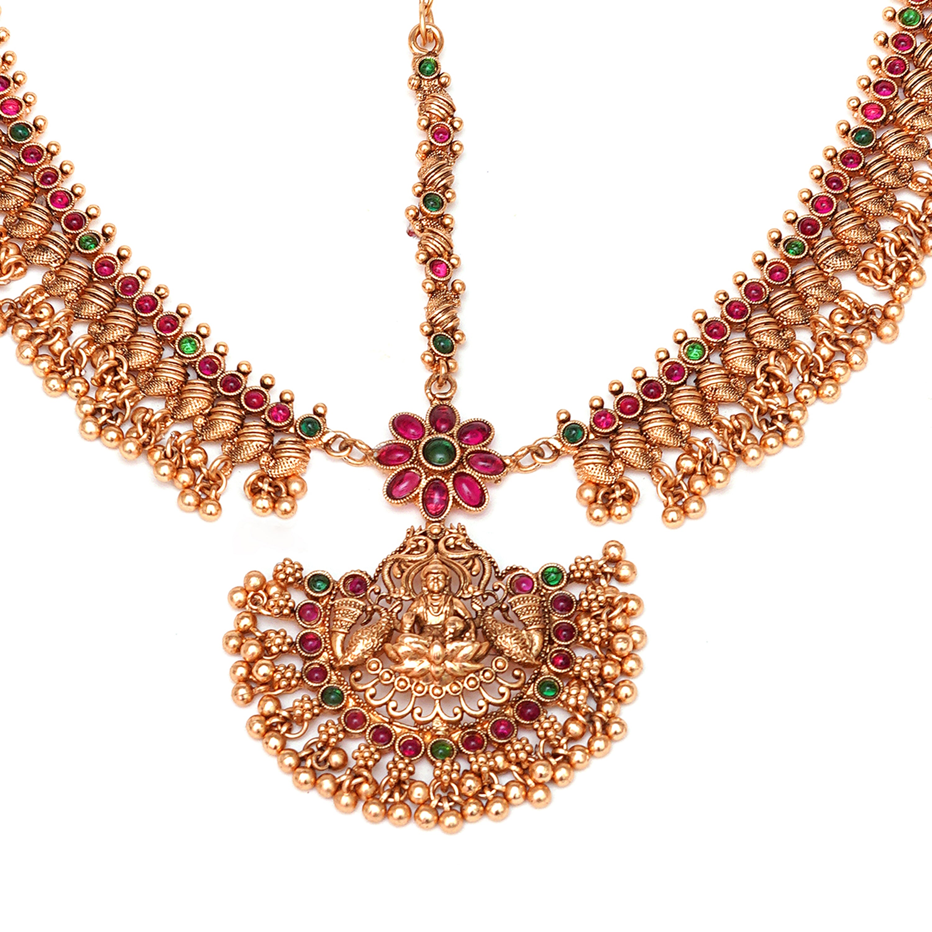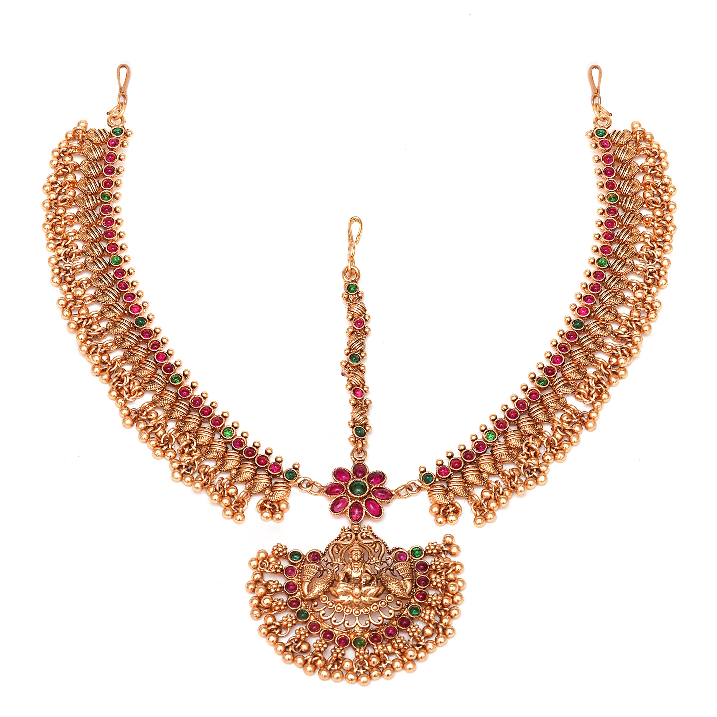 This beautiful bridal look mathapatti is handcrafted in copper alloy with minute & intricate gold work of very fine quality . This mathapatti is coated with 22 Kt matt gold plating which gives a very real look to the design . An absolutely gorgeous piece and is very light in weight.