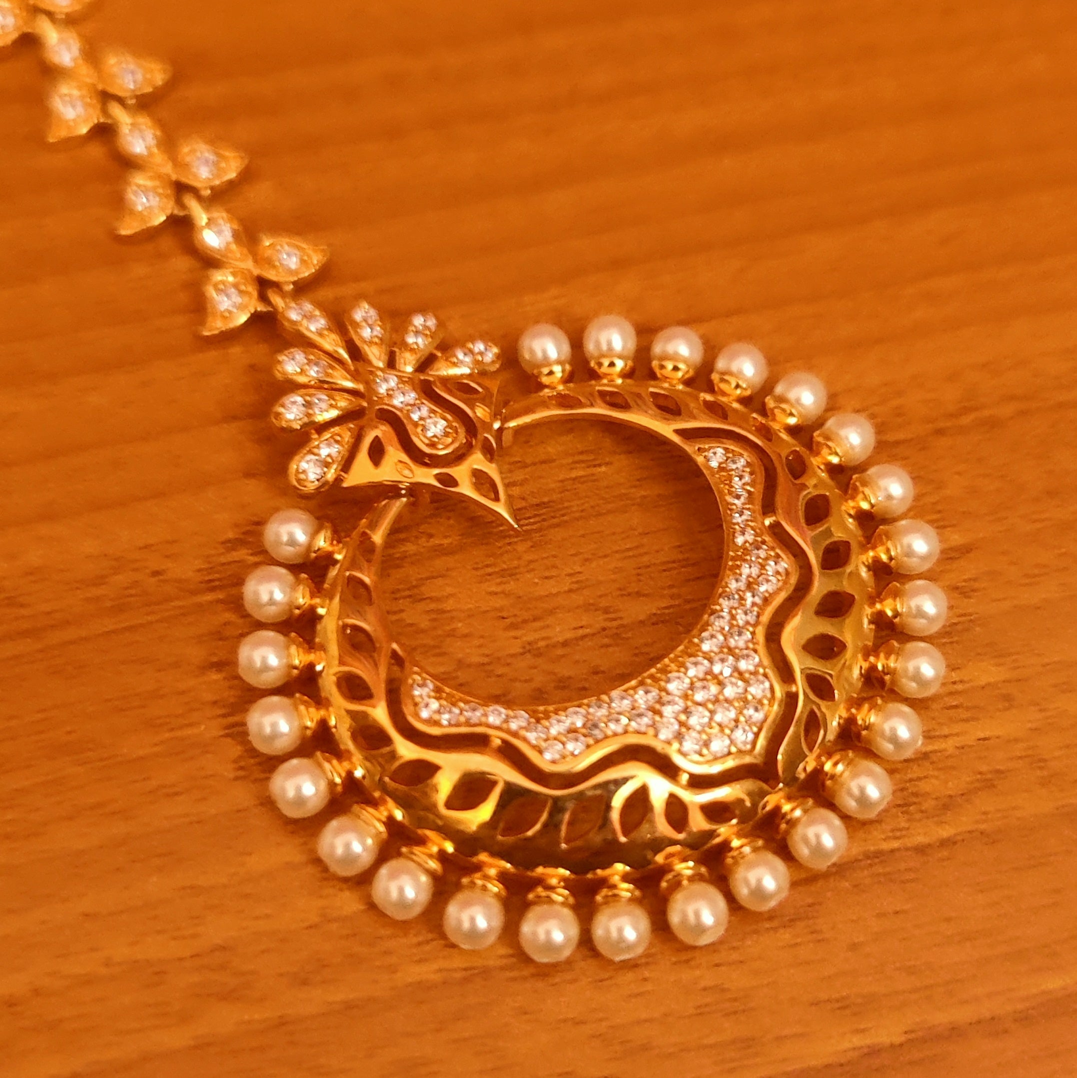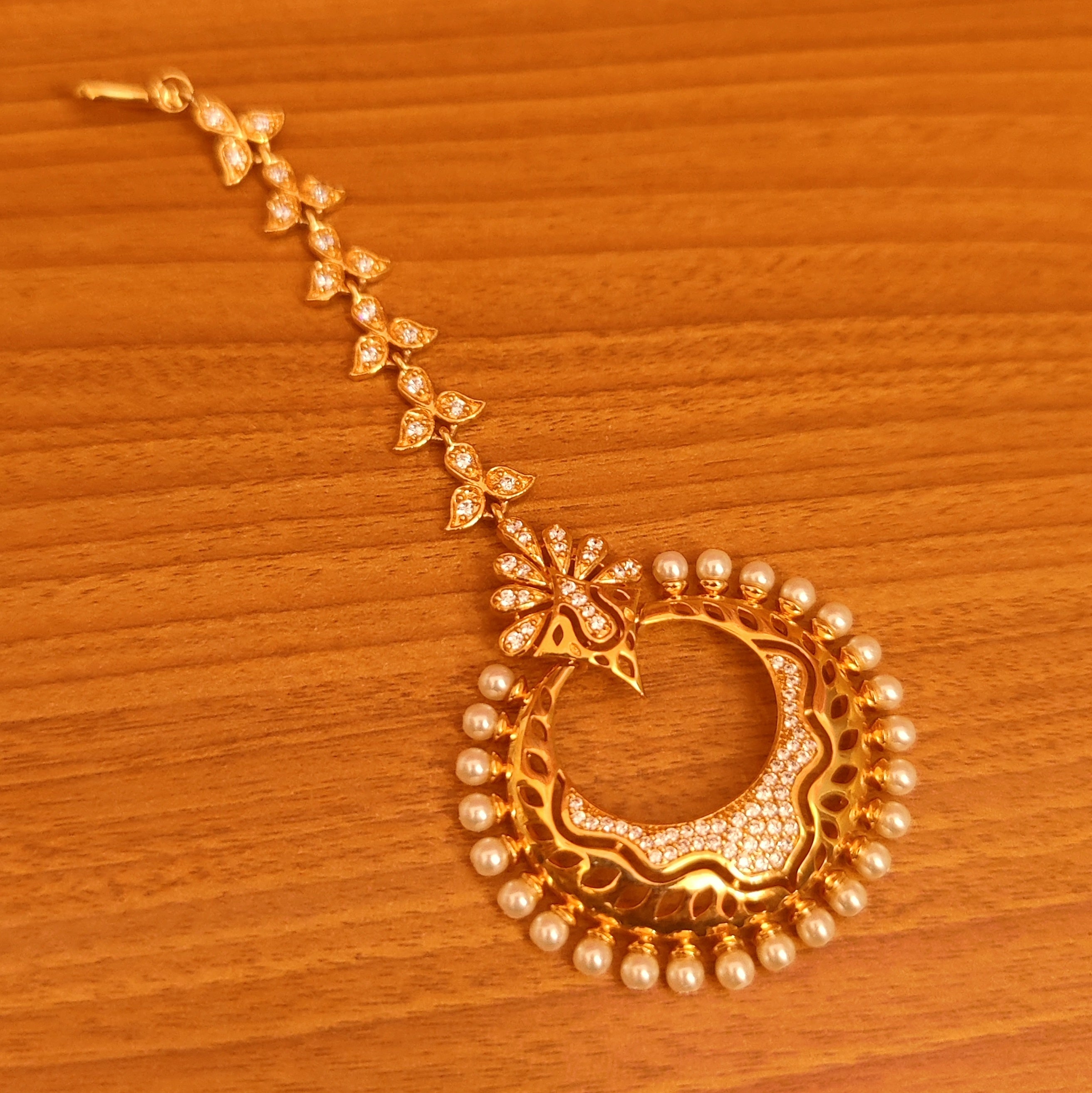 This beautifull maang tikka is handcrafted in brass alloy with imitation cz stone and pearls work of very fine quality . this maang tikka is coated with 18 kt gold polish which give it a real look . an absolutely stunning piece to own and is very light in weight.