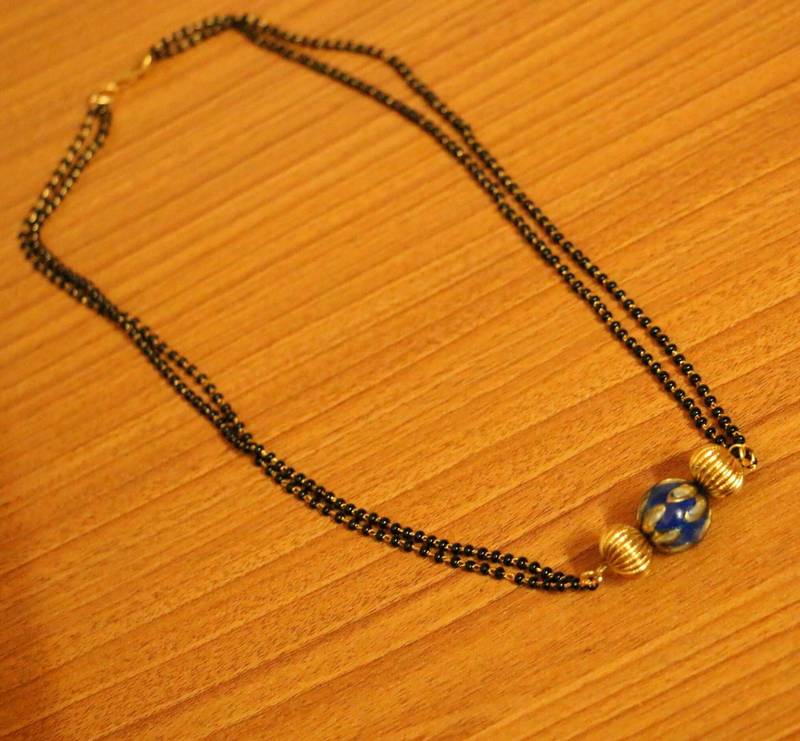 This beautiful mangalsutra is handcrafted in beaded alloy with imitation blue beads with meenakari work of very fine quality . This mangalsutra is coated with 18 kt gold polish which give them a unique look . An absolutely stunning piece to own and are very light in weight.
