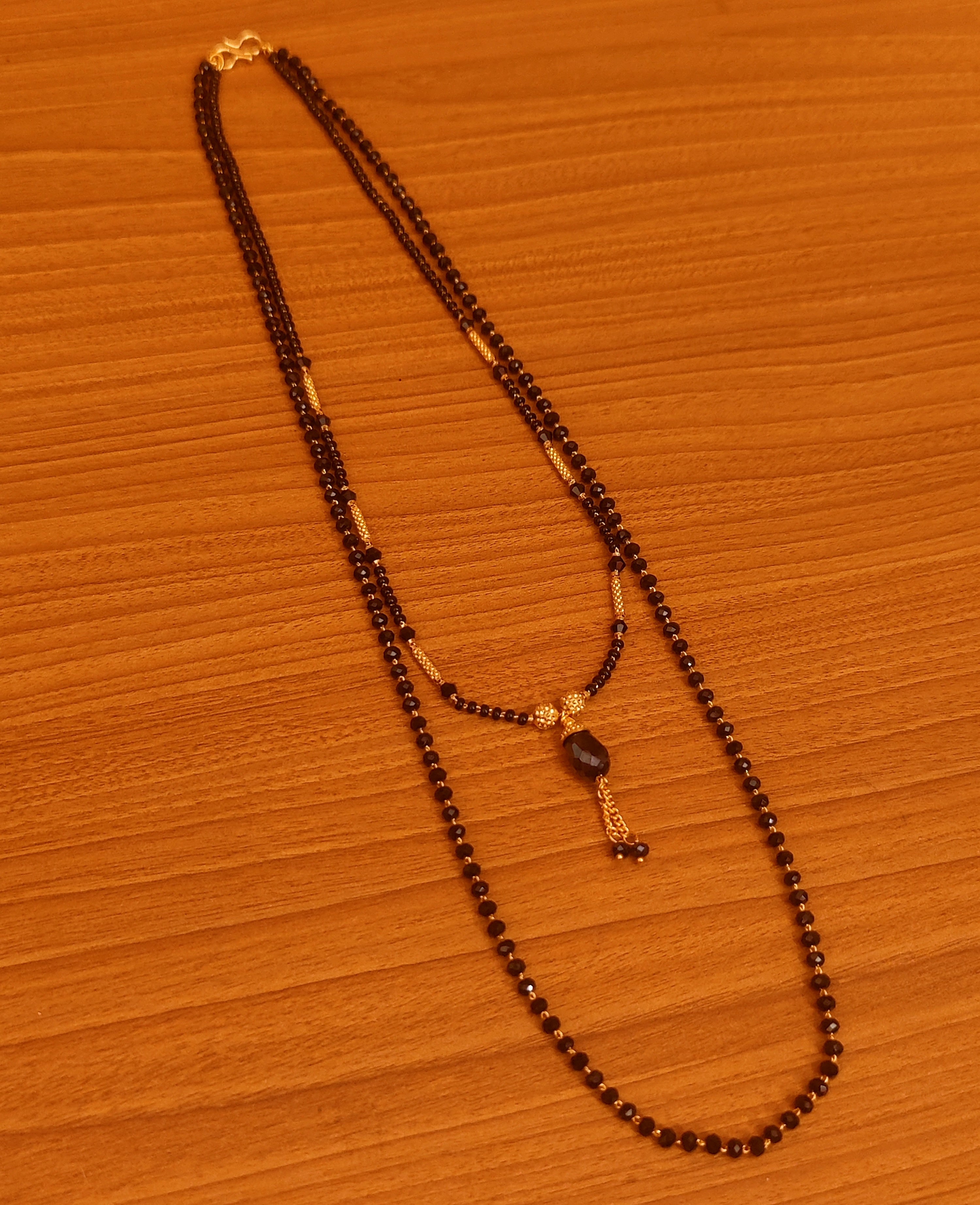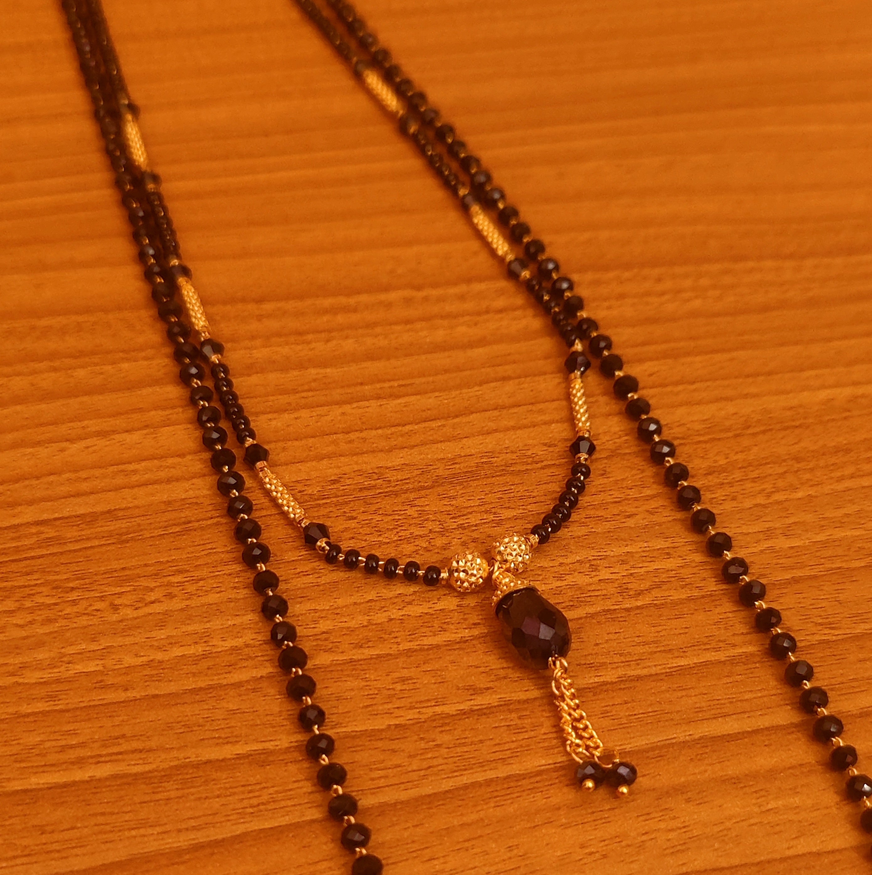 This mangalsutra is handcrafted in brass alloy with imitation black & gold beads work of very fine quality , the mangalsutra set is plated in 18kt gold plating and the design itself is perfect for wedding attires.