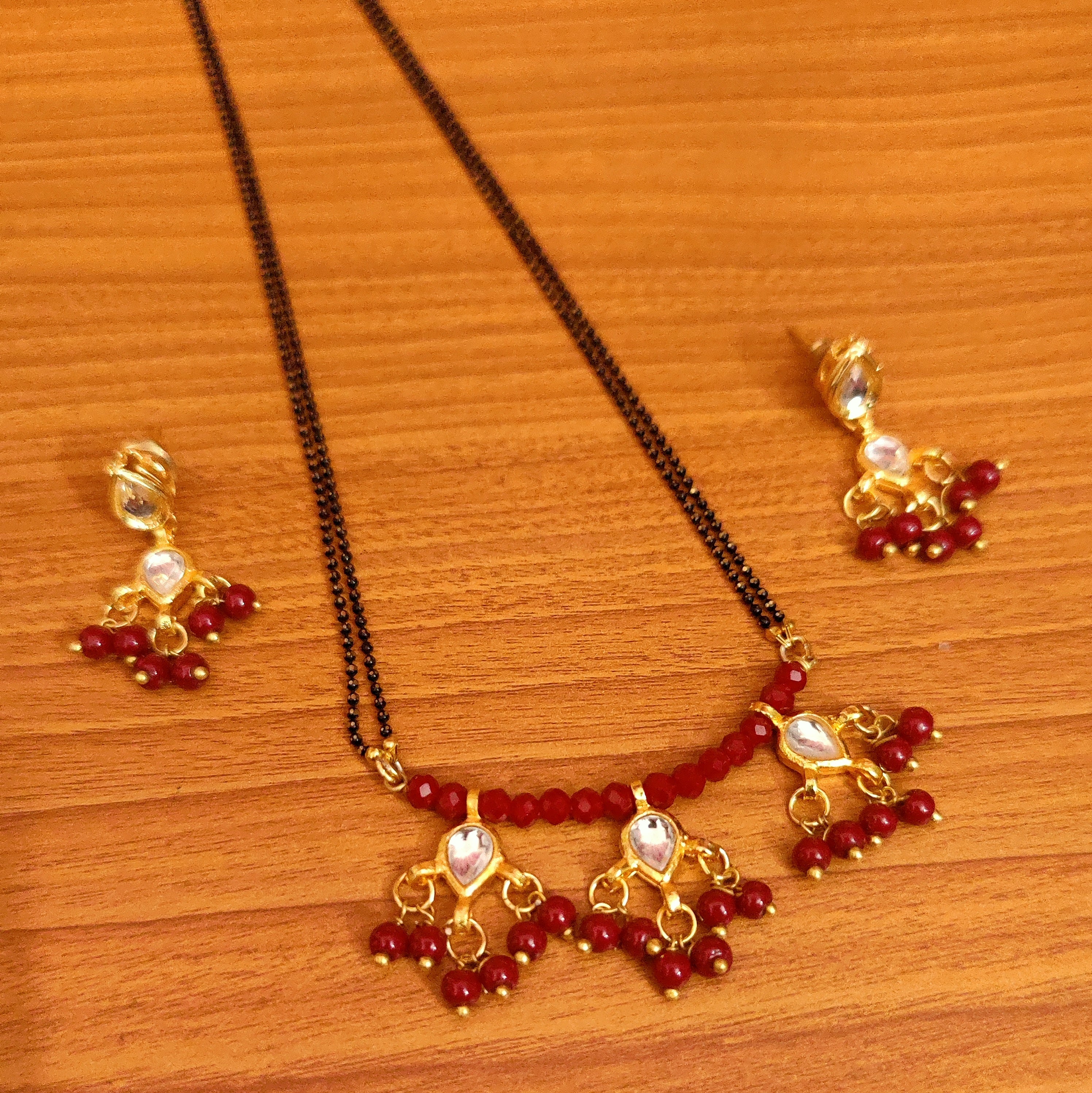 This Mangalsutra Is Handcrafted In Brass Alloy With Imitation Maroon Colour Swarovski Crystal Beads Work Of Very Fine Quality , The Mangalsutra Set Is Plated In 18kt Gold Plating And The Design Itself Is Perfect For Wedding Attires.