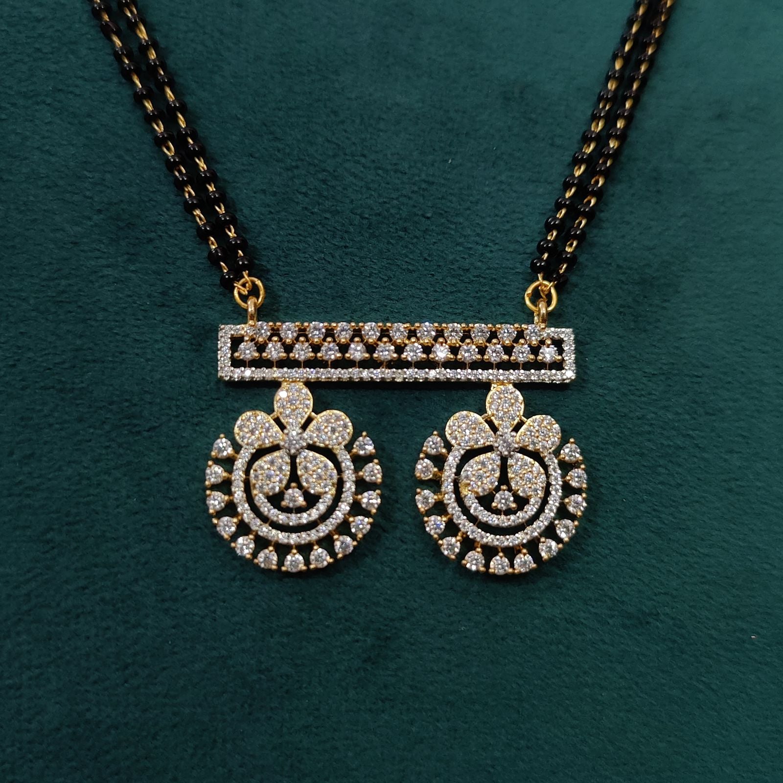 This diamond look gold-plated mangalsutra set is designed with premium CZ stones that sparkle just like real diamonds. The double black bead chain is paired with a stunning pendant and matching earrings, making it the perfect blend of tradition and modern elegance.