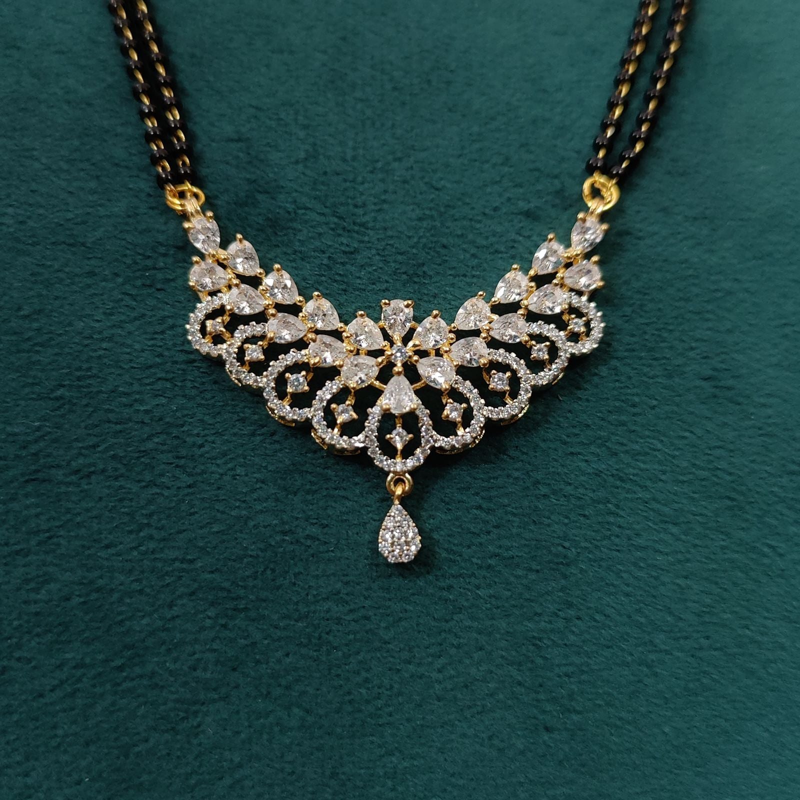 Celebrate your love with this Floral CZ Diamond Look Mangalsutra Set from Sanvi Jewels. Designed with intricate flower motifs and studded with sparkling cubic zirconia stones, this mangalsutra brings together traditional charm and modern elegance. The matching earrings complete the look, making it a perfect choice for daily wear, weddings, festivals, or gifting your loved one.