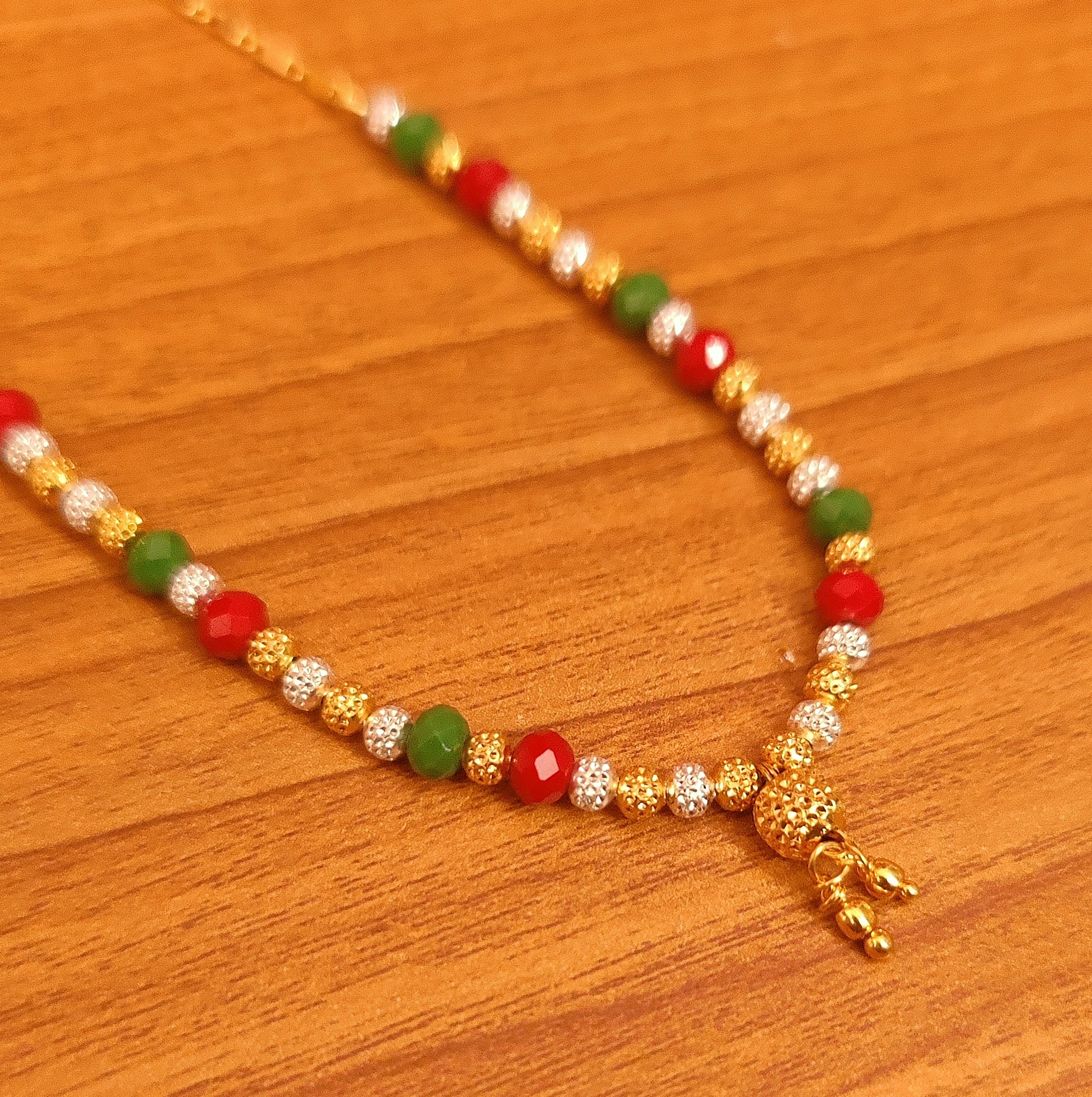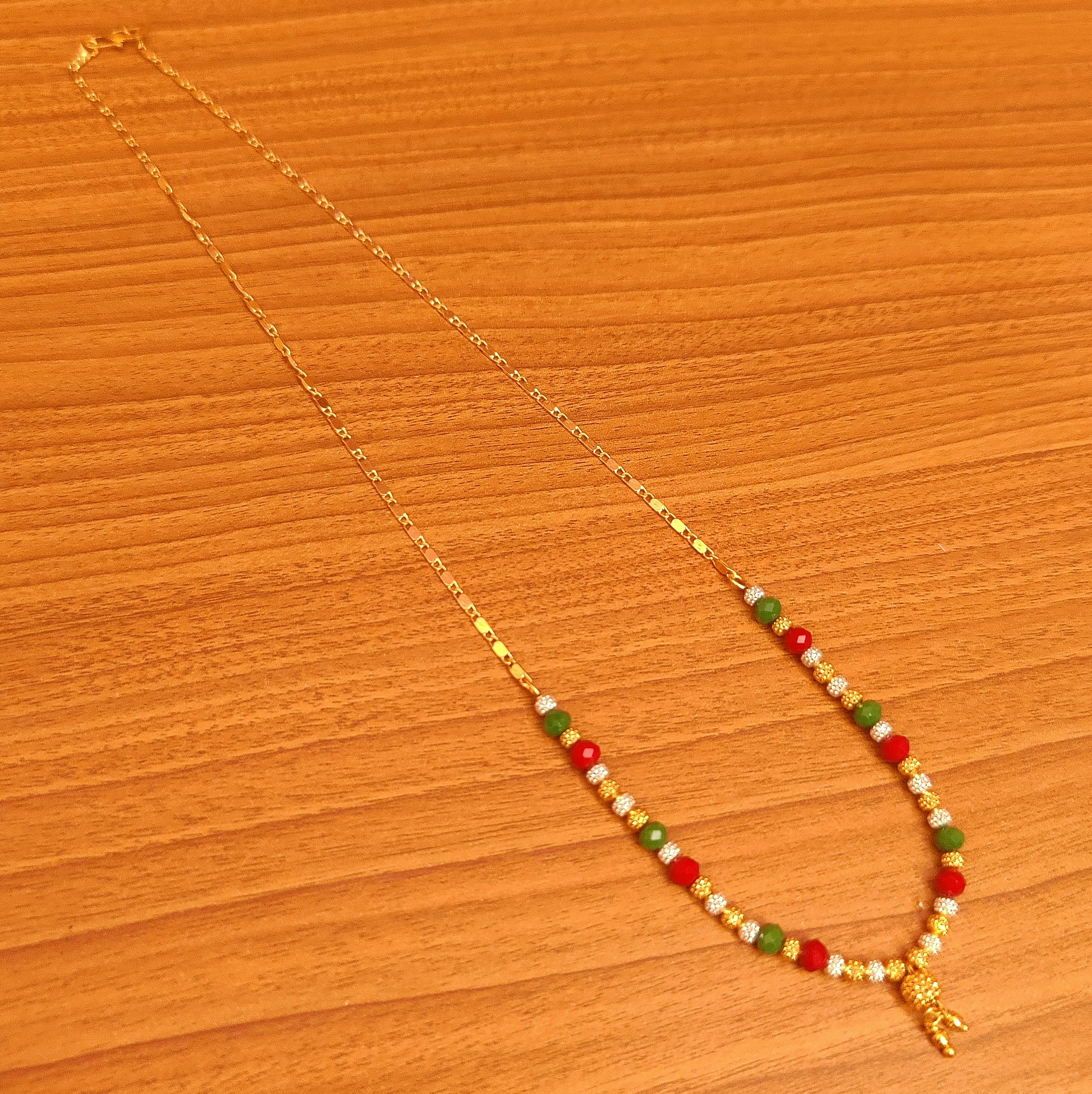This beautiful mangalsutra is handcrafted in copper alloy with imitation multicolour crystal beads of very fine quality , this mangalsutra is coated with 18 kt nickle free gold plating to avoid skin allergies and its very light in weight .