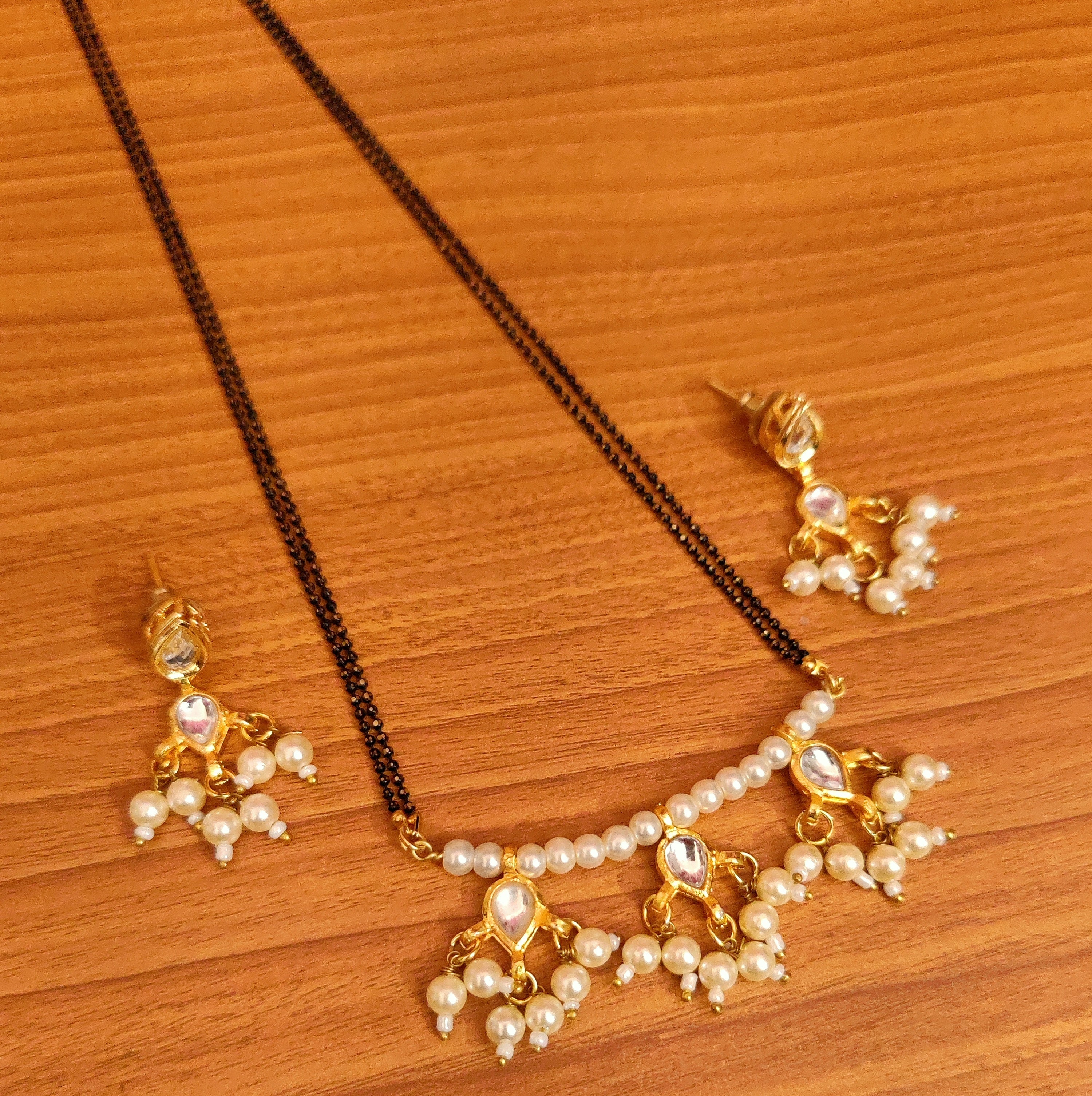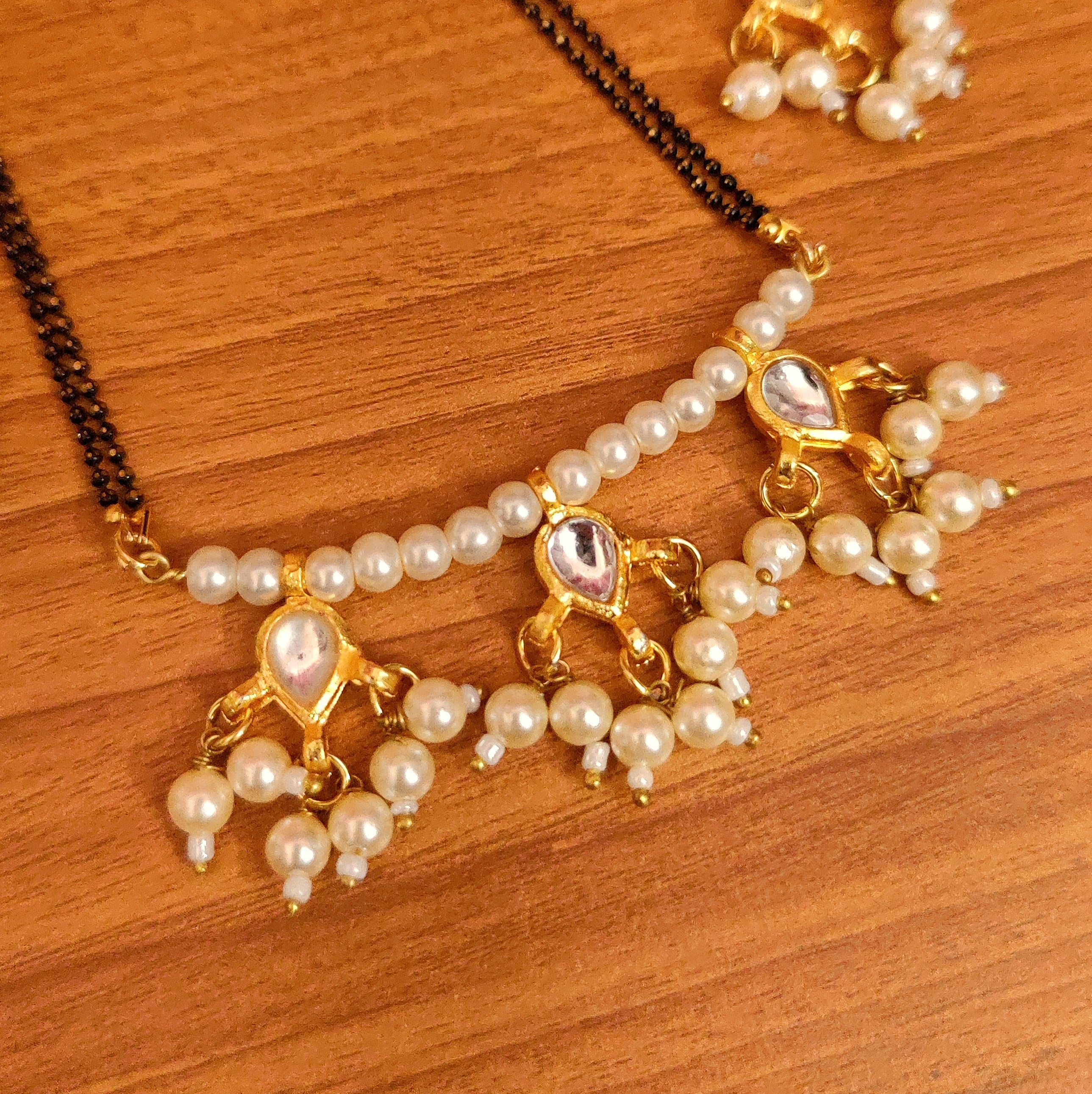 This Mangalsutra Is Handcrafted In Brass Alloy With Imitation Semi Precious White Pearls Work Of Very Fine Quality , The Mangalsutra Set Is Plated In 18kt Gold Plating And The Design Itself Is Perfect For Wedding Attires.