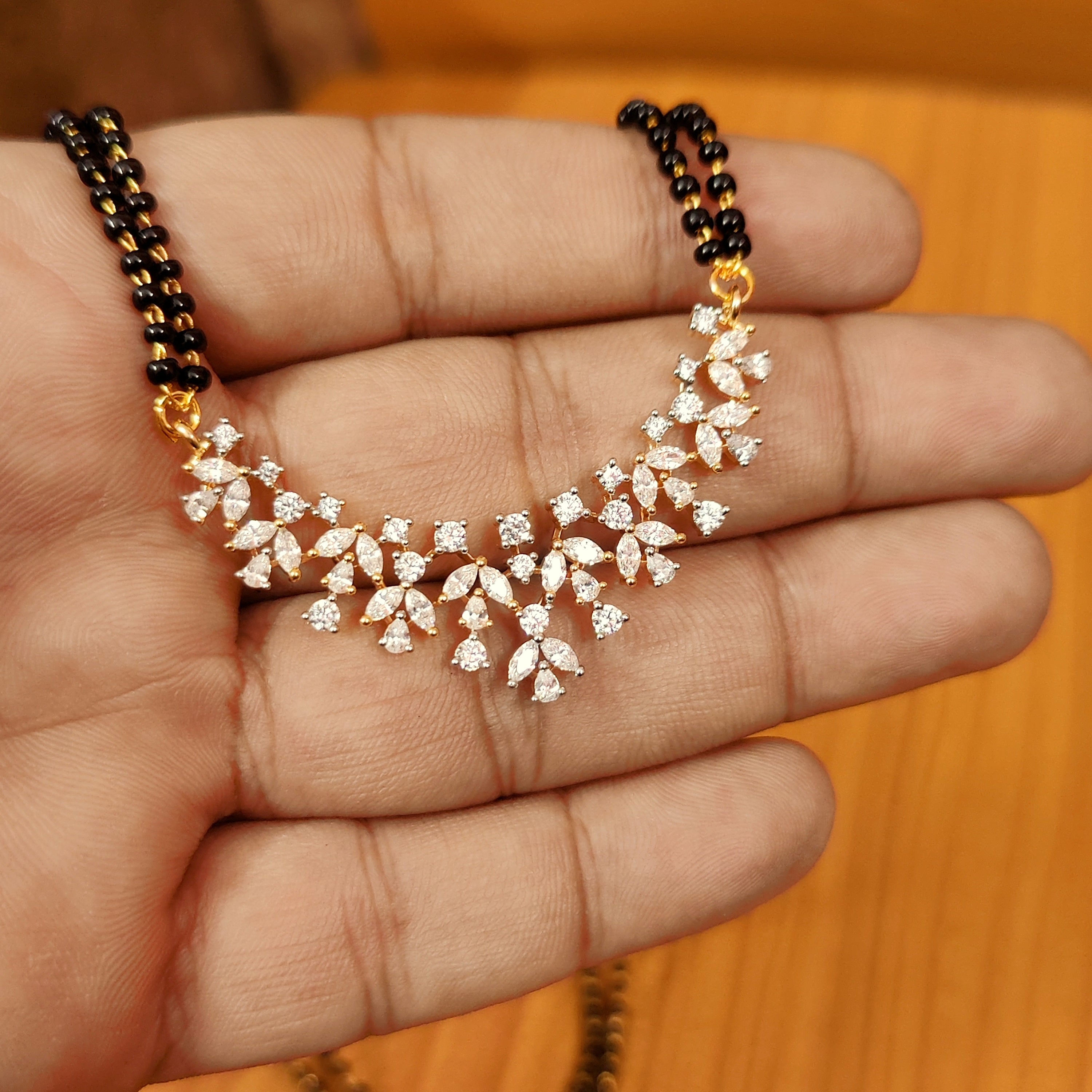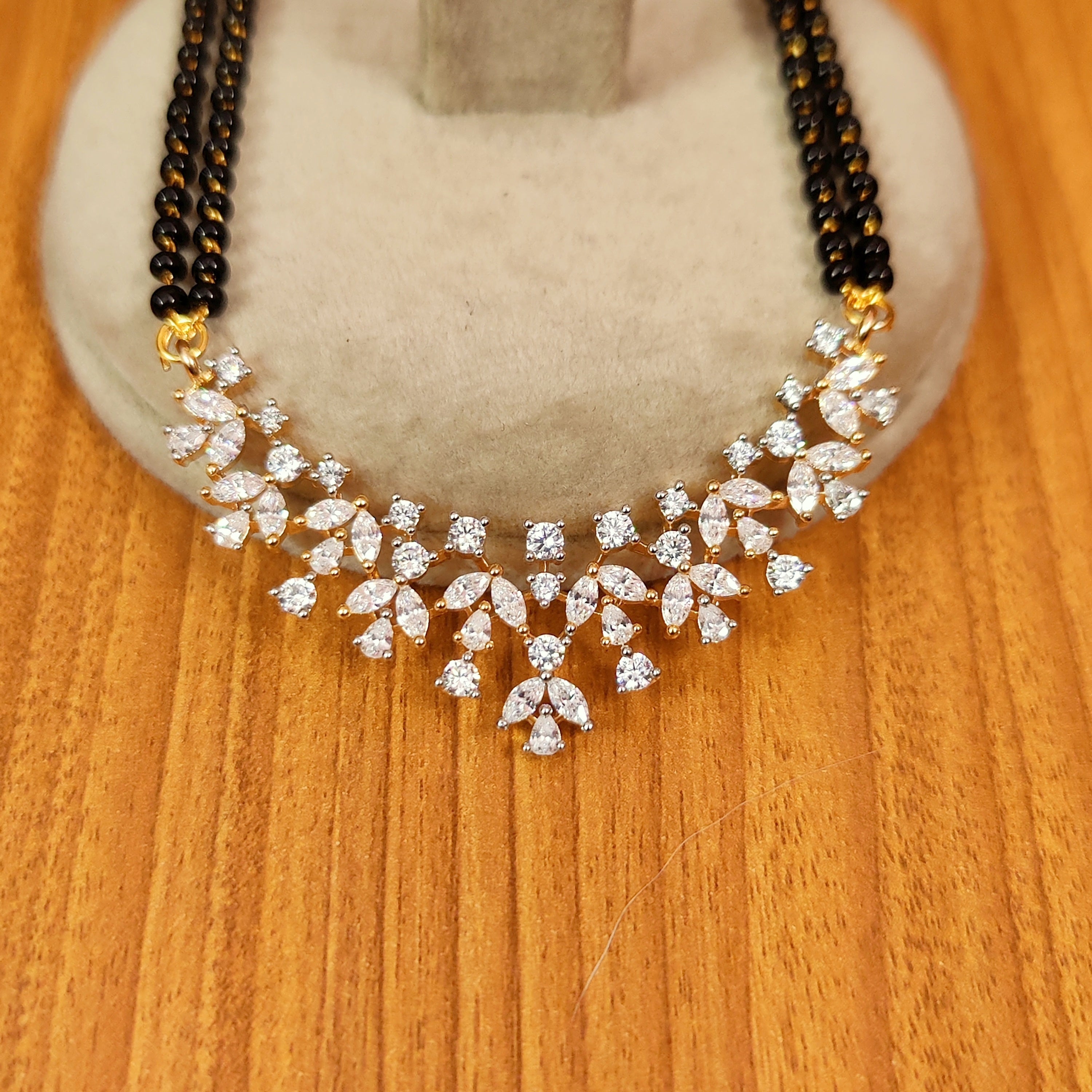 Transform your conventional appearance with our exceptional diamond look mangalsutra. With its genuine diamond-like shine, high-quality cz stones, and luxurious 18kt gold plating, this trending mangalsutra is a must-have for any married woman. Experience the allure of real diamond jewelry without the hefty price tag.