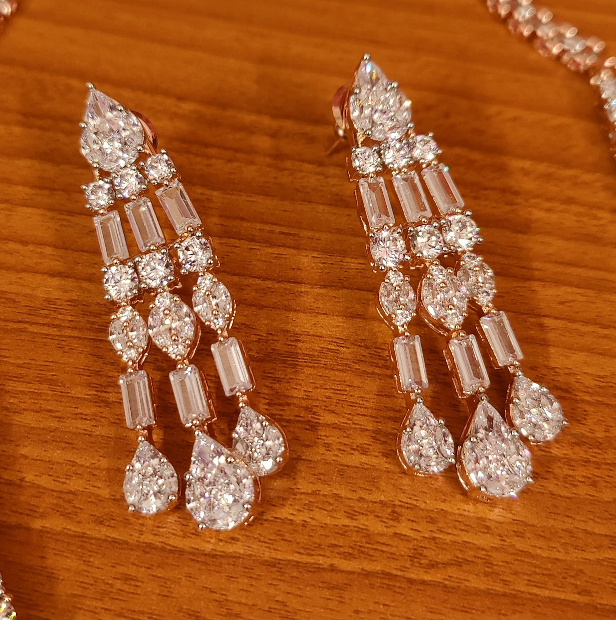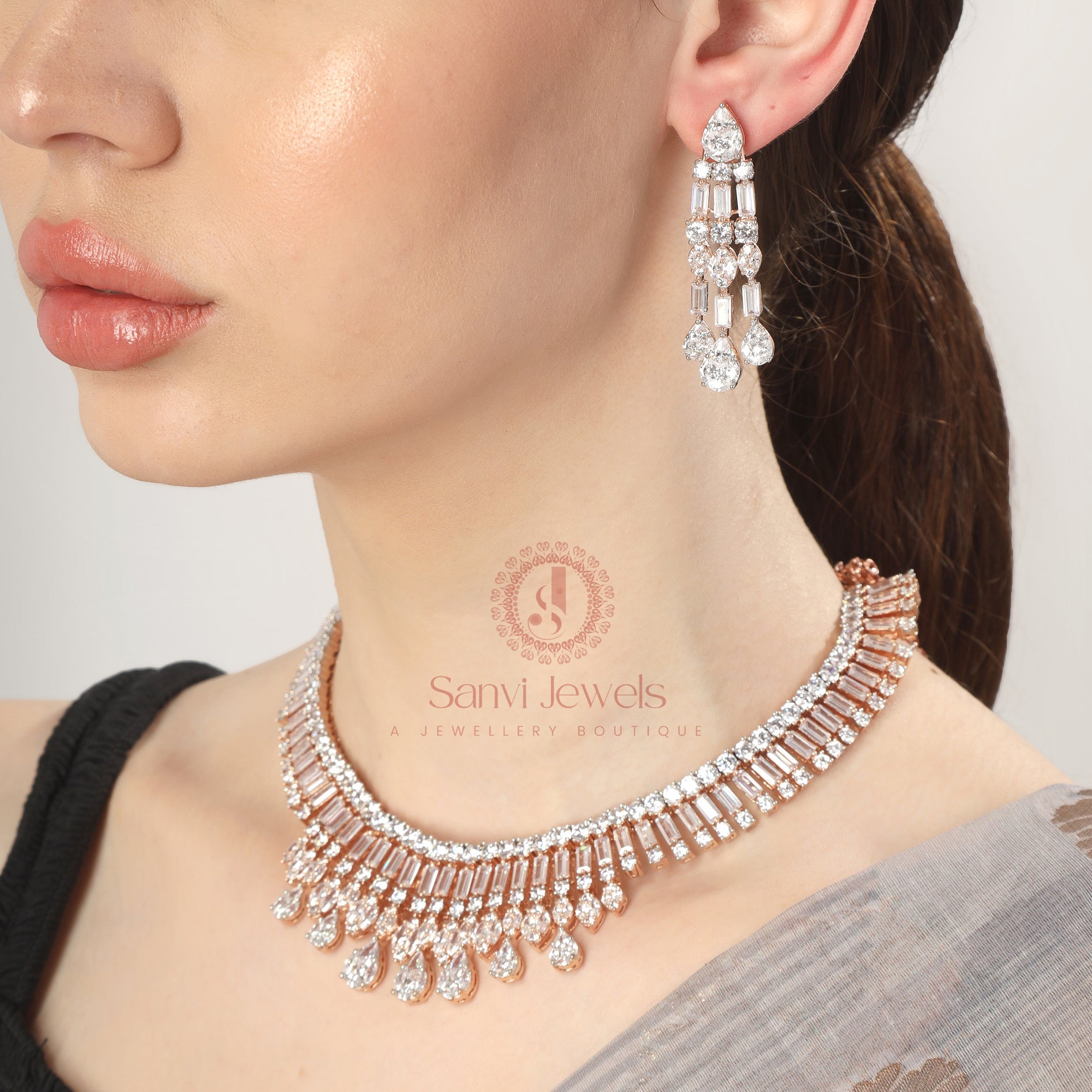 This beautiful necklace set is handcrafted in brass alloy with imitation cz stone of very fine quality . this necklace set is coated with 18 kt rose gold rhodium plating that gives a real gold look . an absolutely stunning piece to own and are light in weight.