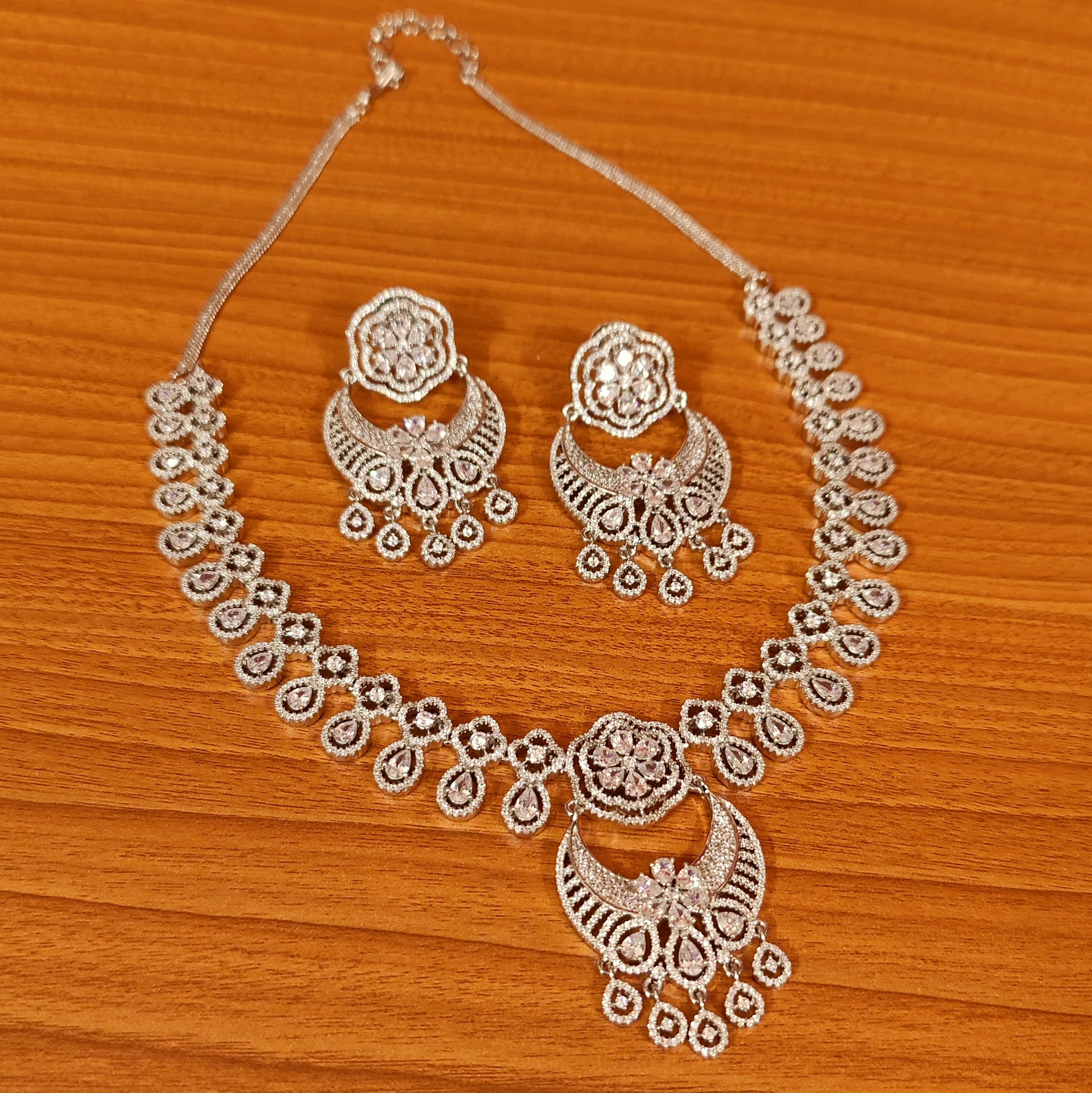 WHITE GOLD PLATED CZ STUDDED DIAMOND LOOK NECKLACE SET