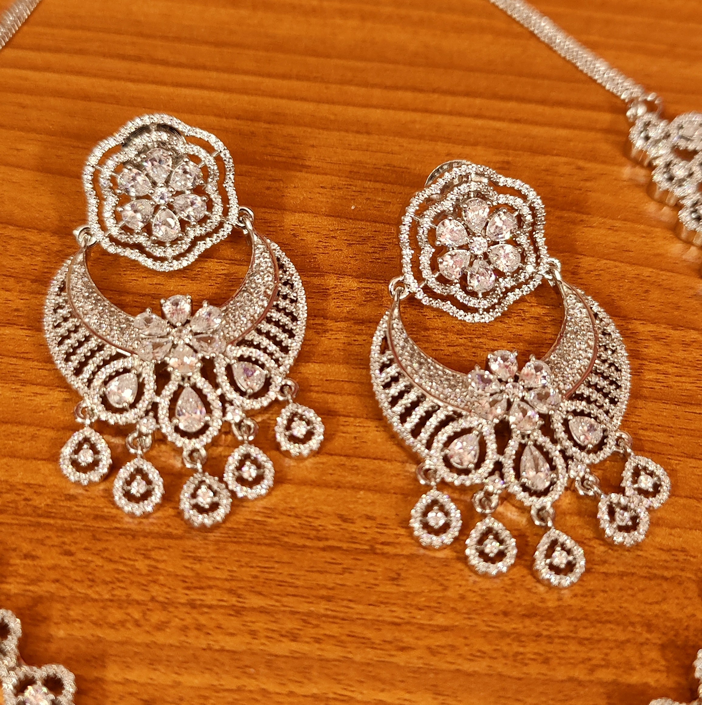 This beautiful necklace set is handcrafted in silver alloy with imitation cz stone of very fine quality . this necklace set is coated with 18 kt white gold rhodium plating that gives a real gold look . an absolutely stunning piece to own and are light in weight.