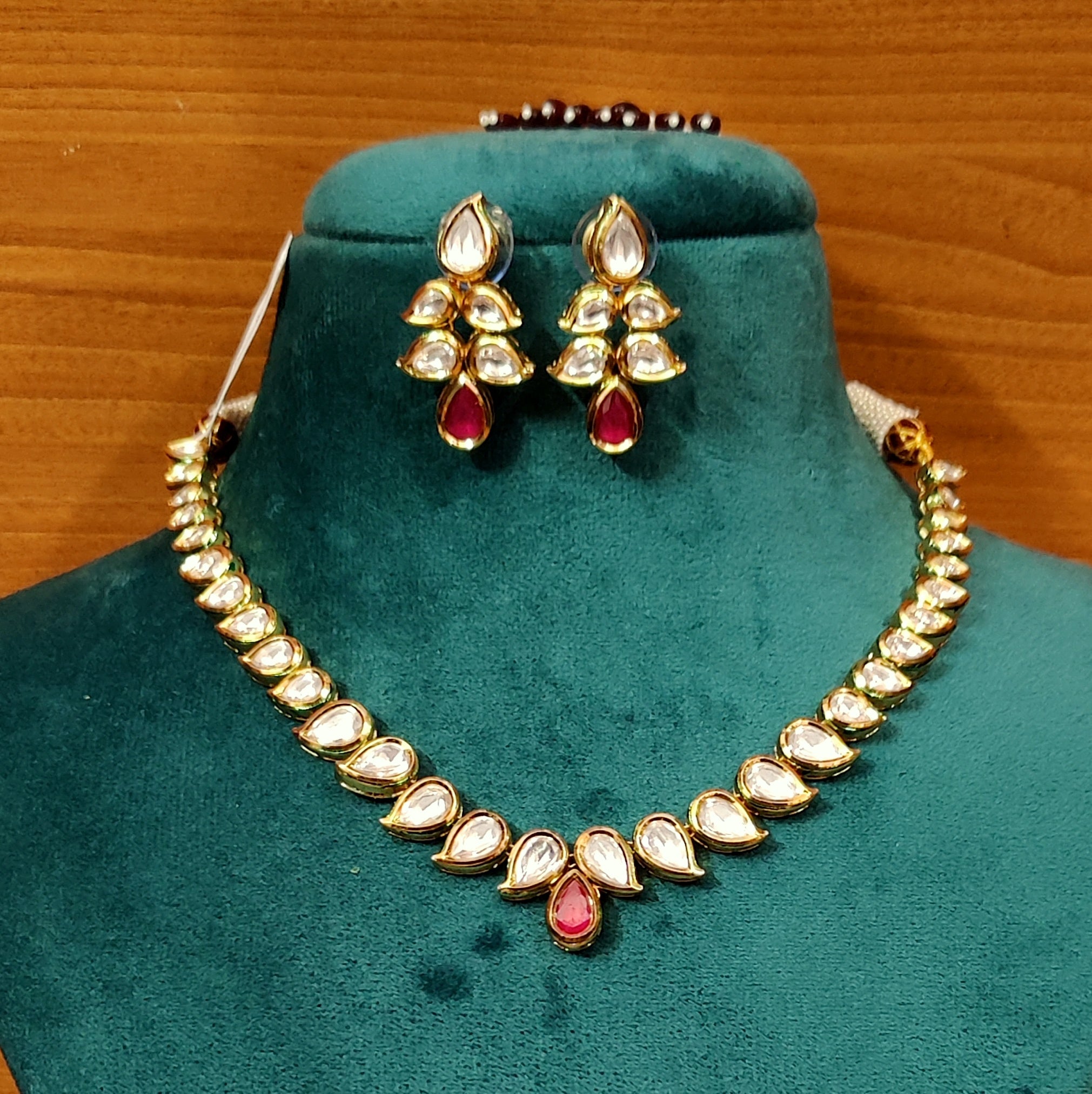 RUBY COLOUR KUNDAN POLKI SINGLE LINE PAISLEY NECKLACE SET