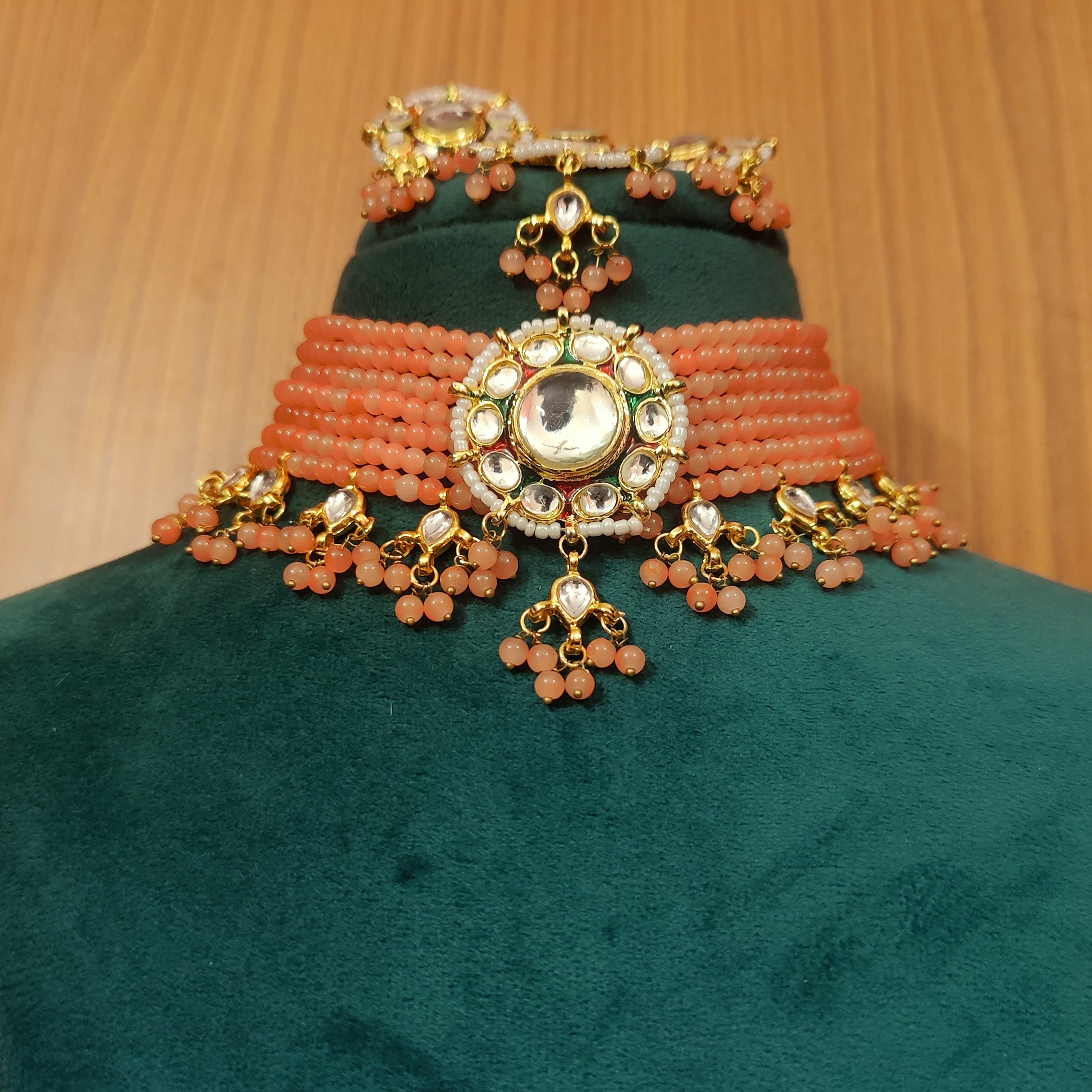 ORANGE BEADS KUNDAN MULTILAYER CHOKER NECKLACE SET
