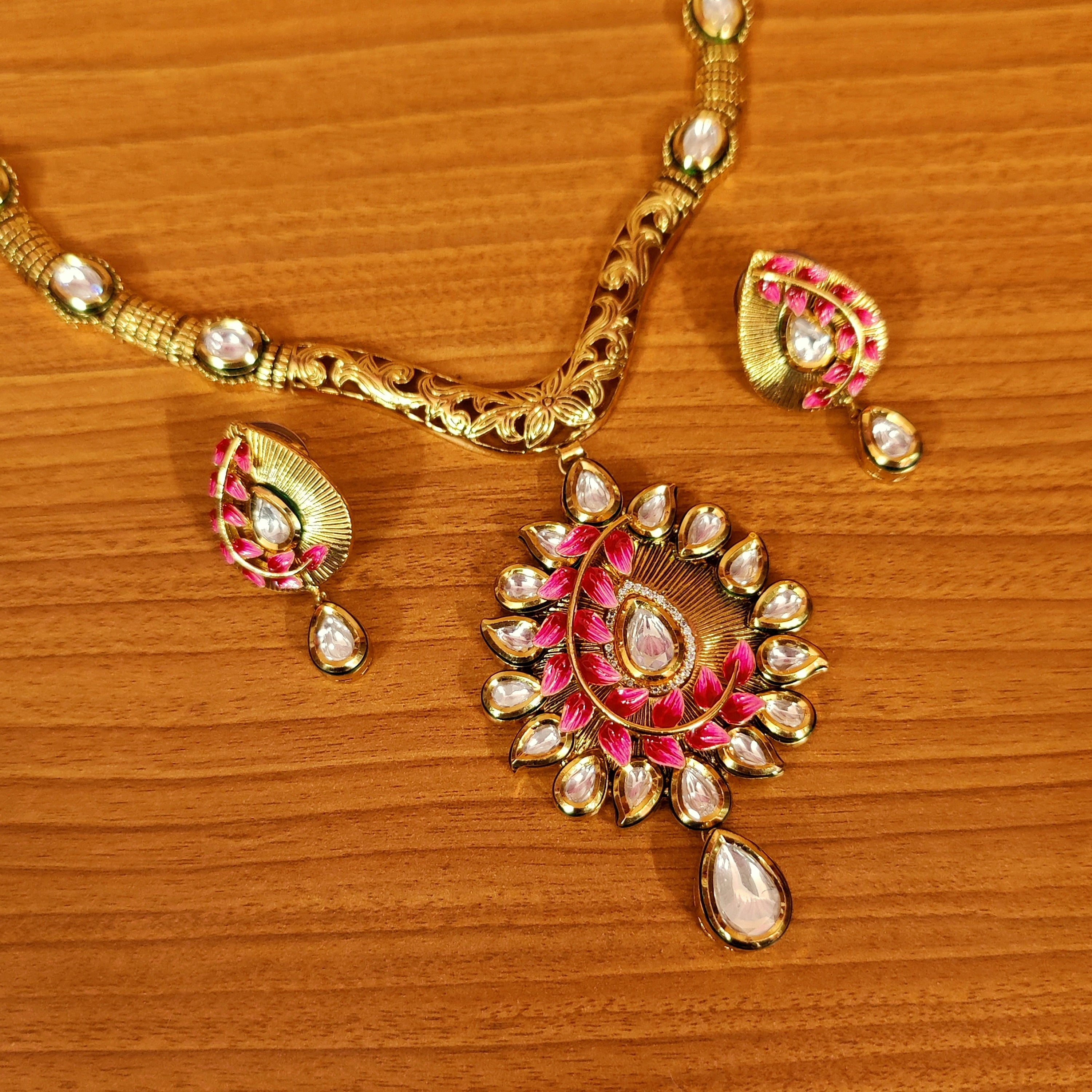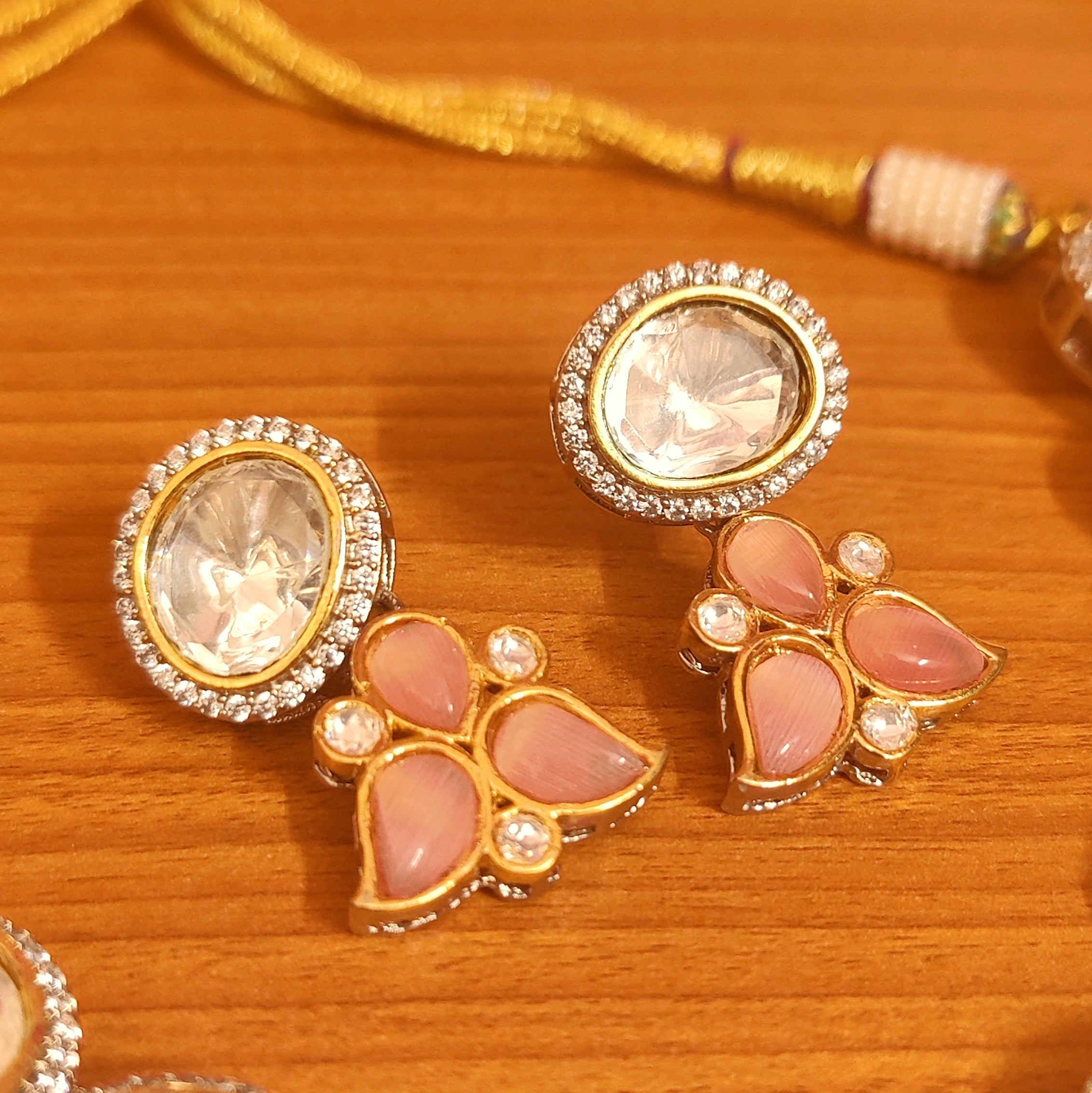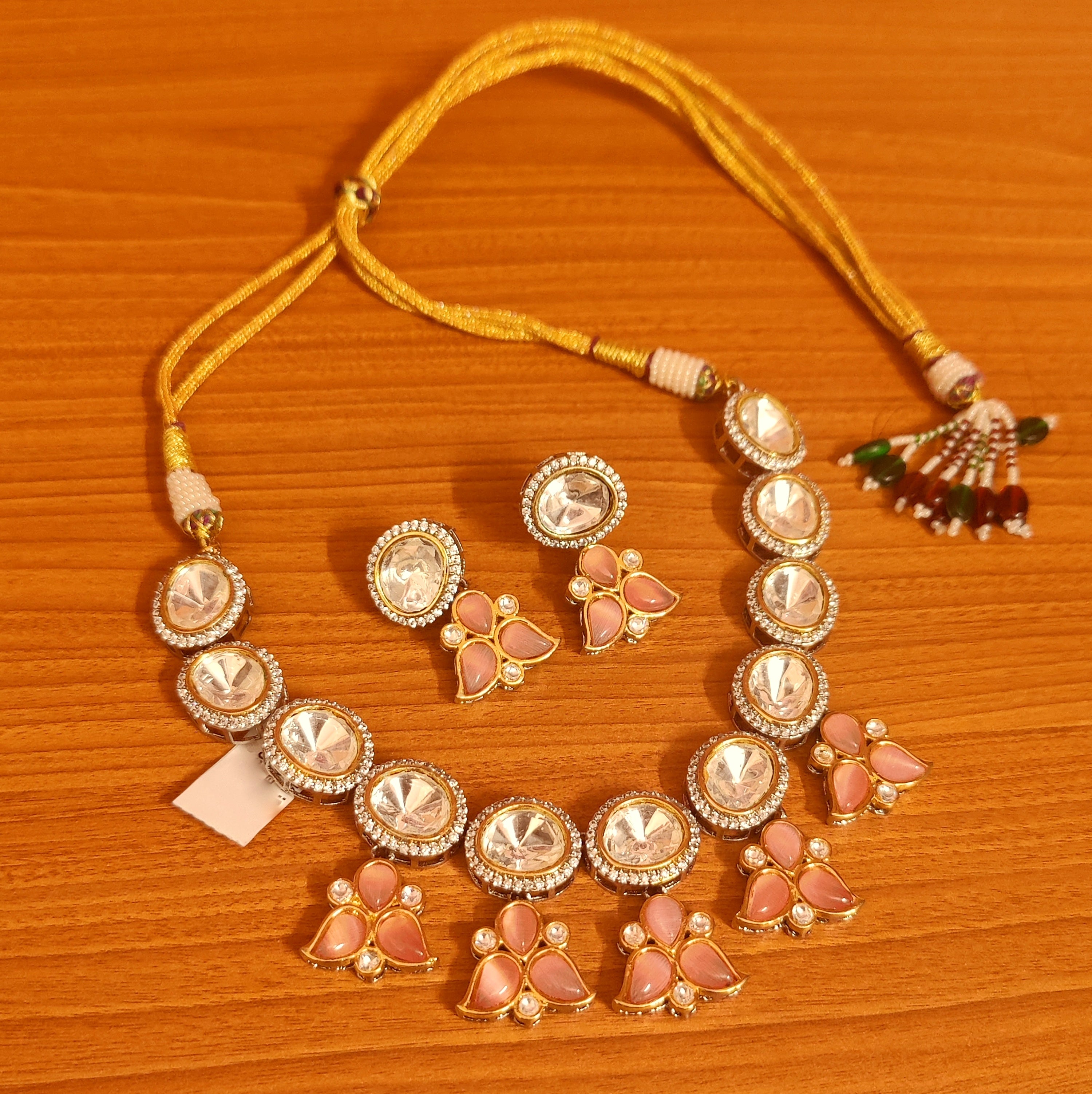 UNCUT KUNDAN MOISSANITE POLKI PINK QUARTZ NECKLACE SET