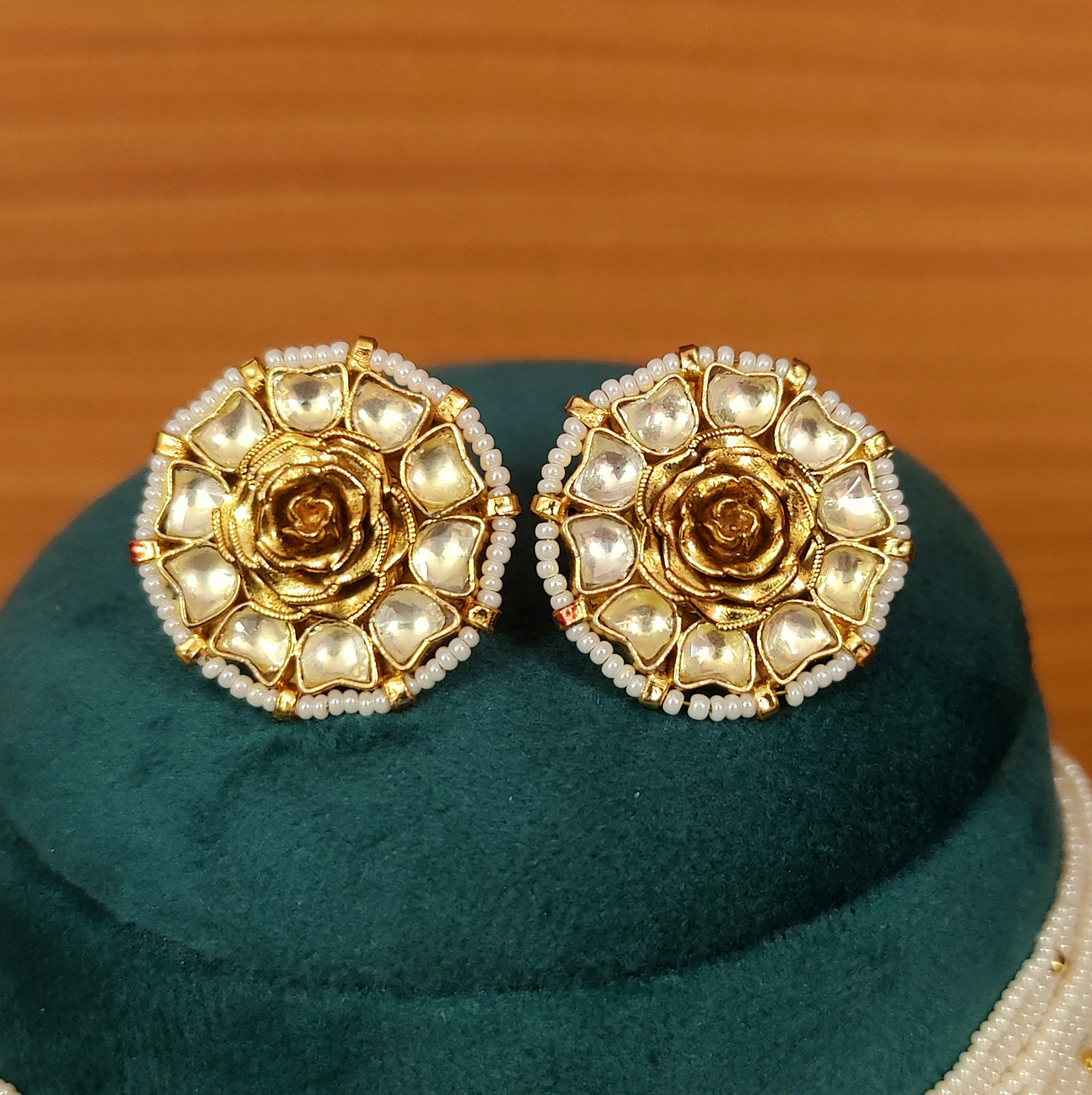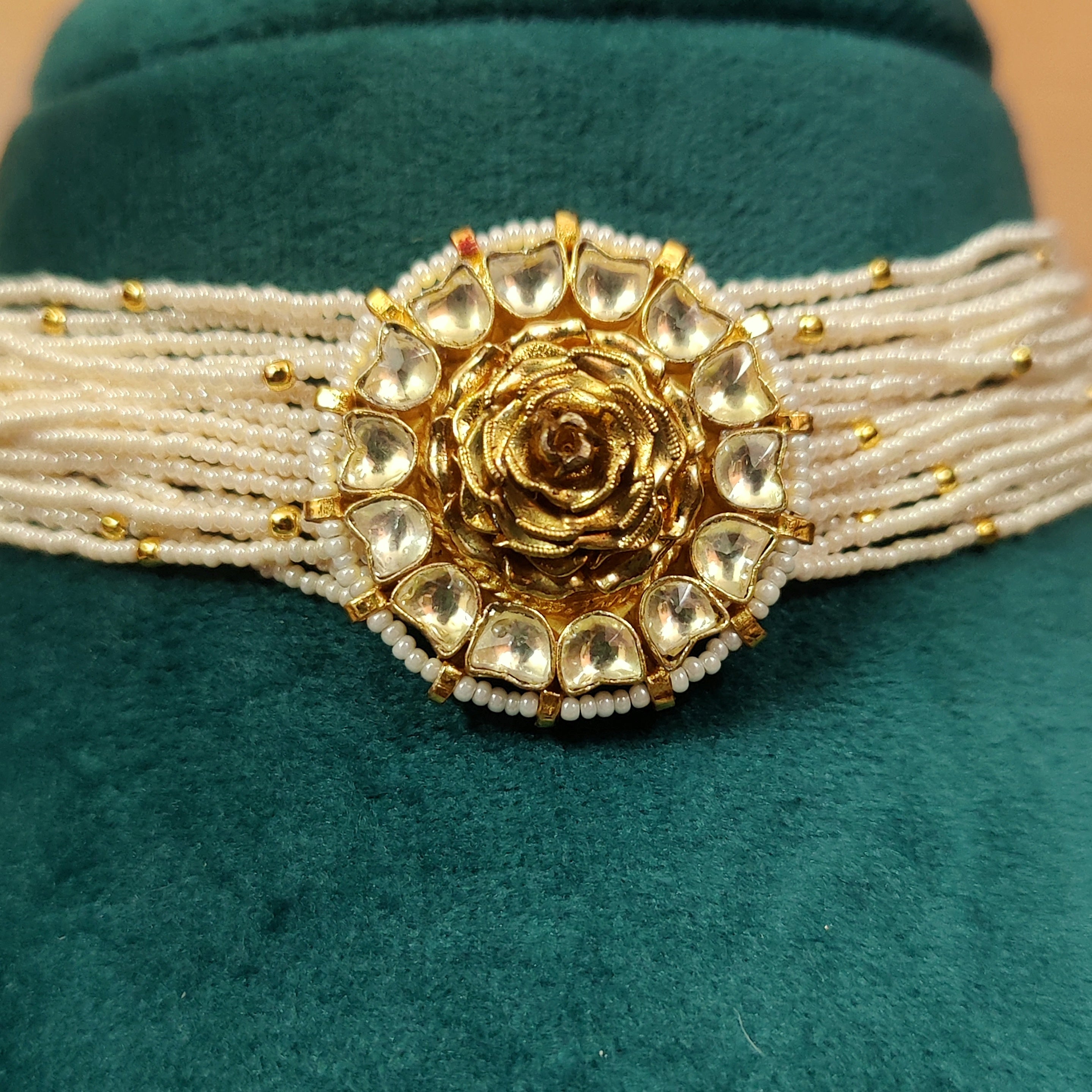 UNCUT KUNDAN POLKI HANDCARVED ROSE PATTERN PEARL CHOKER SET
