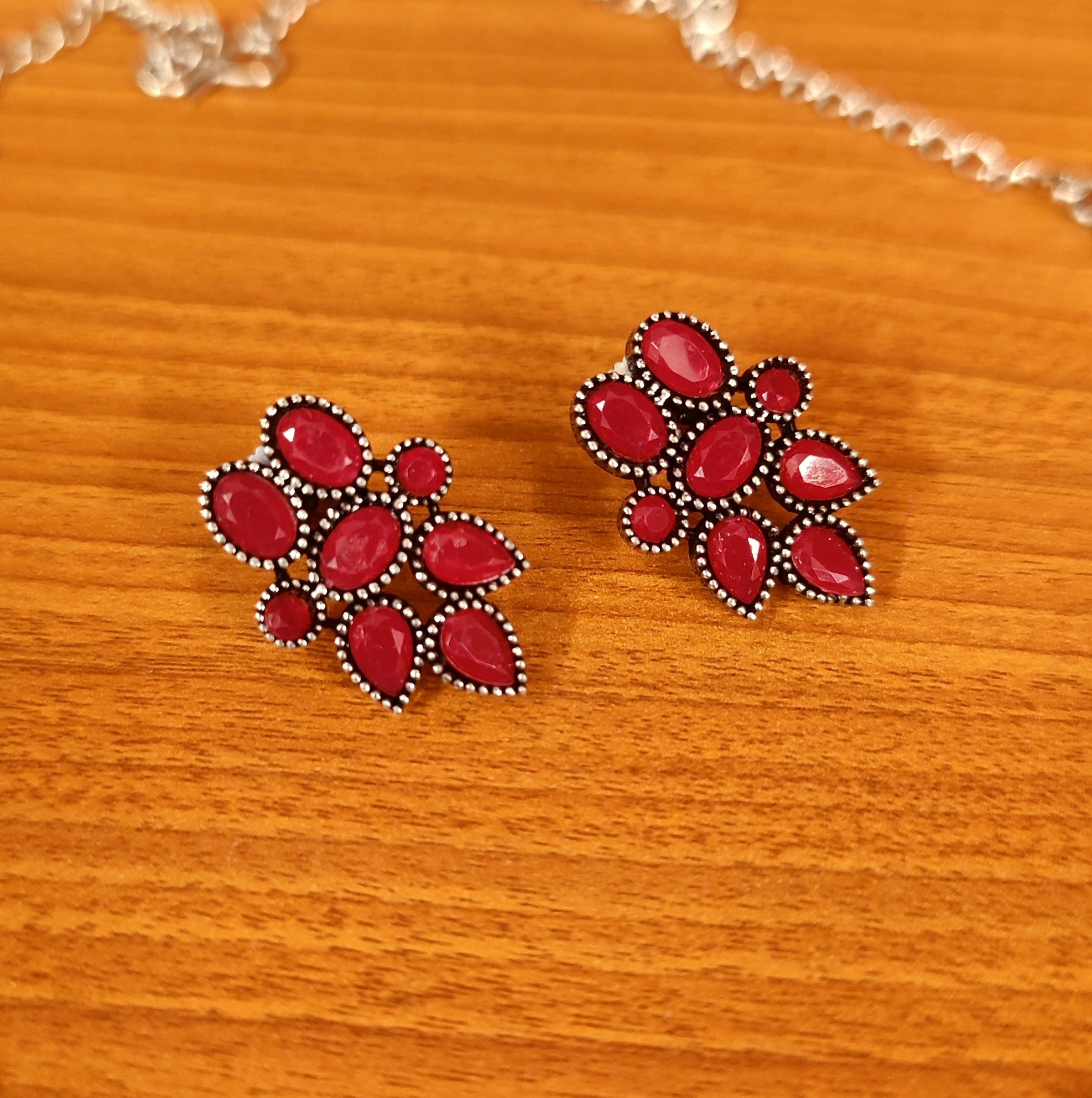 RUBY COLOUR FLOWER PATTERN OXIDISED SILVER NECKLACE SET