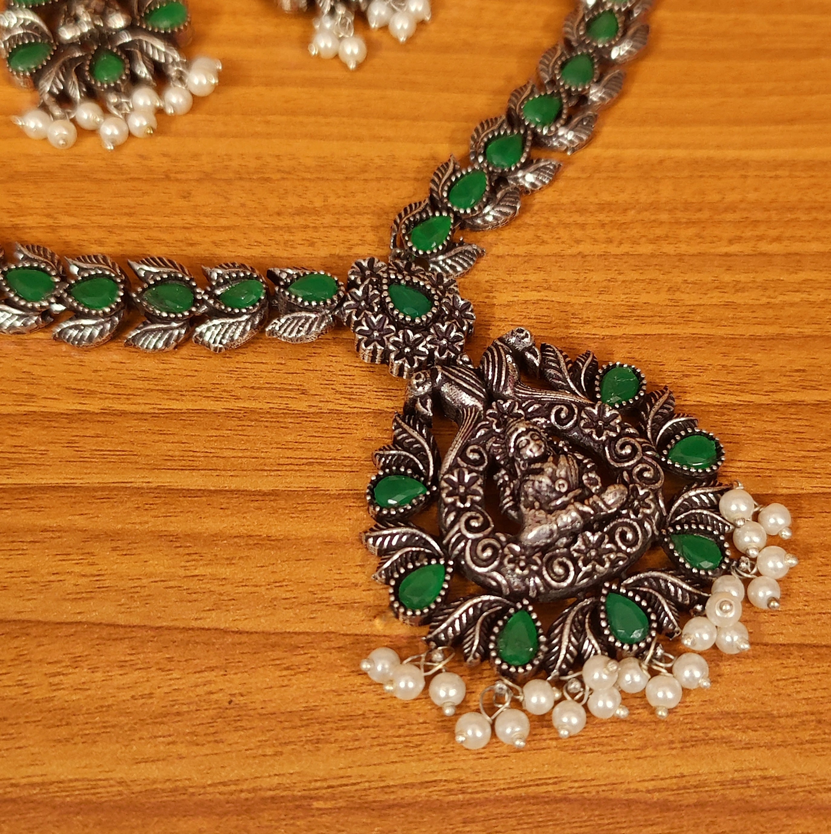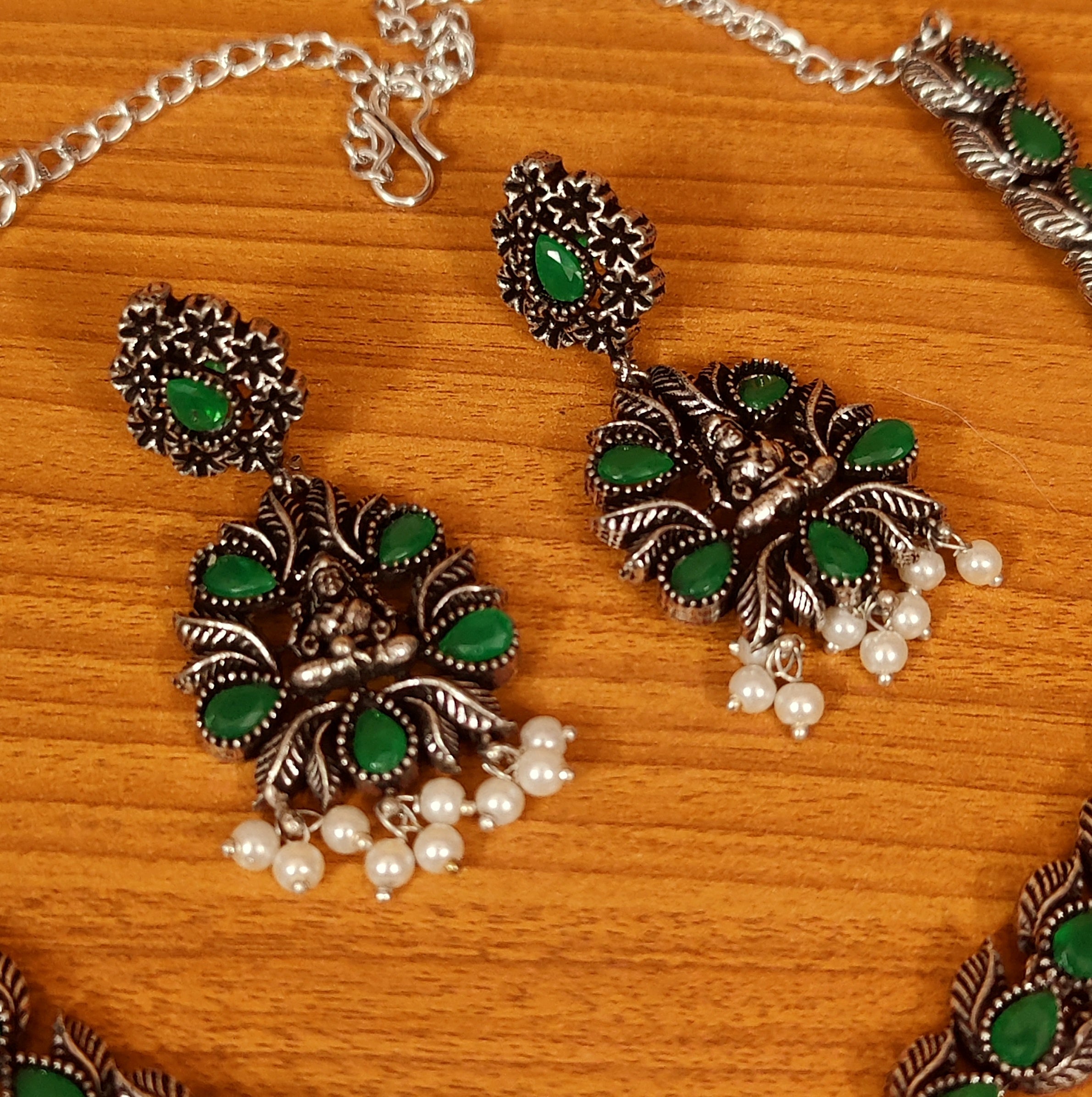 EMERALD COLOUR PEACOCK OXIDISED SILVER NECKLACE SET