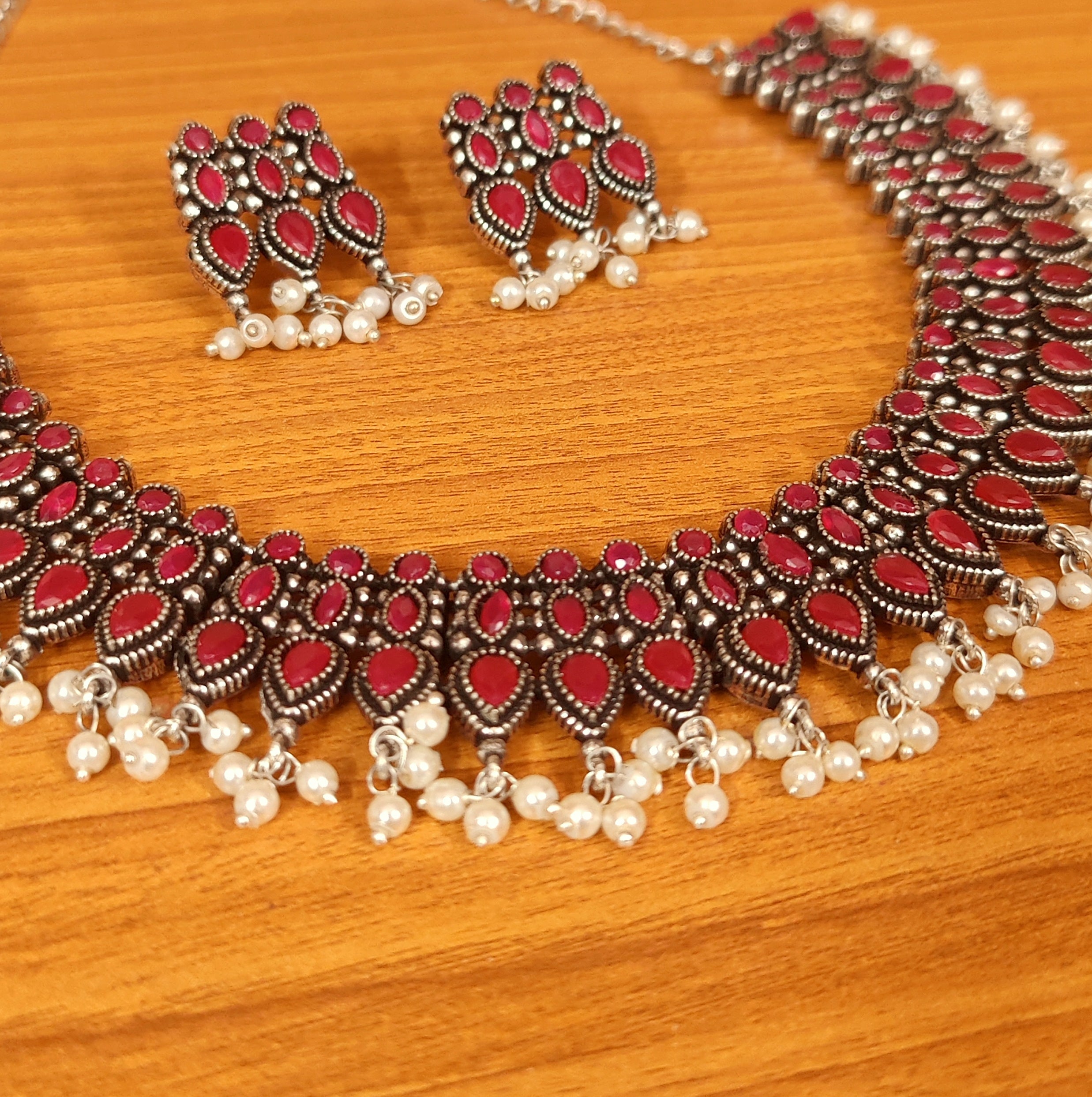 RED COLOR STONE STUDDED OXIDISED SILVER NECKLACE SET