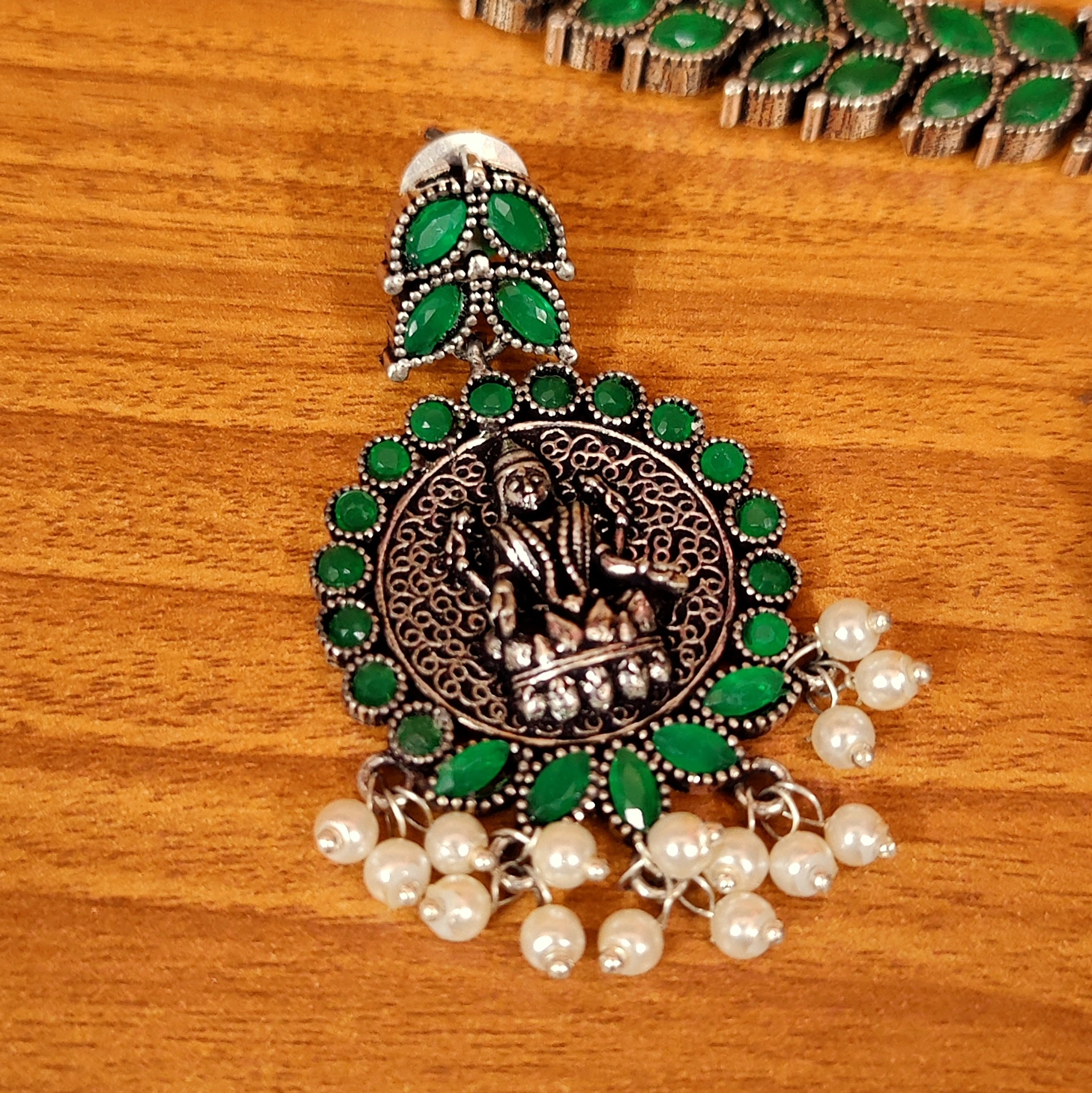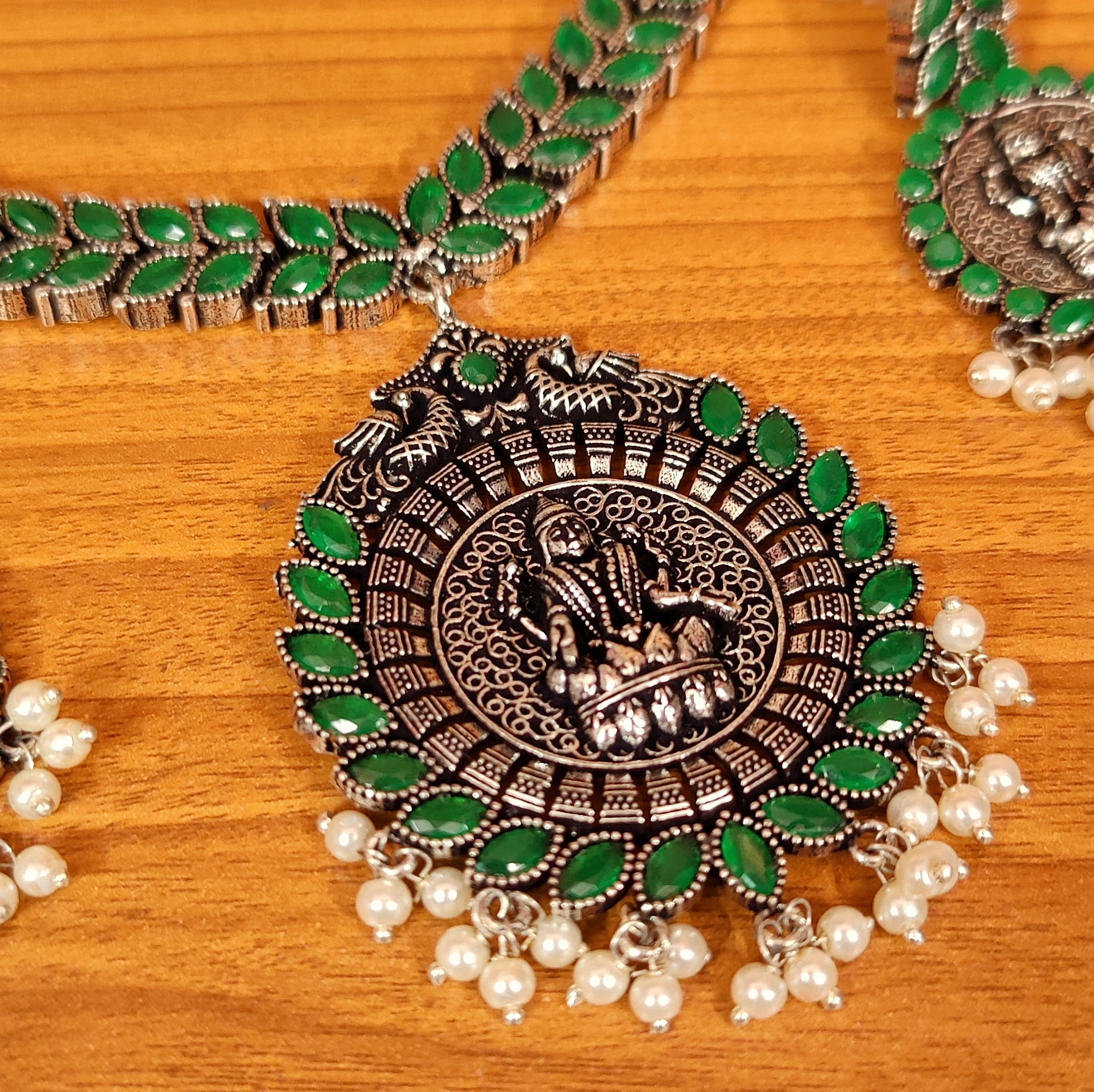 EMERALD LOOK OXIDISED SILVER TEMPLE NECKLACE SET