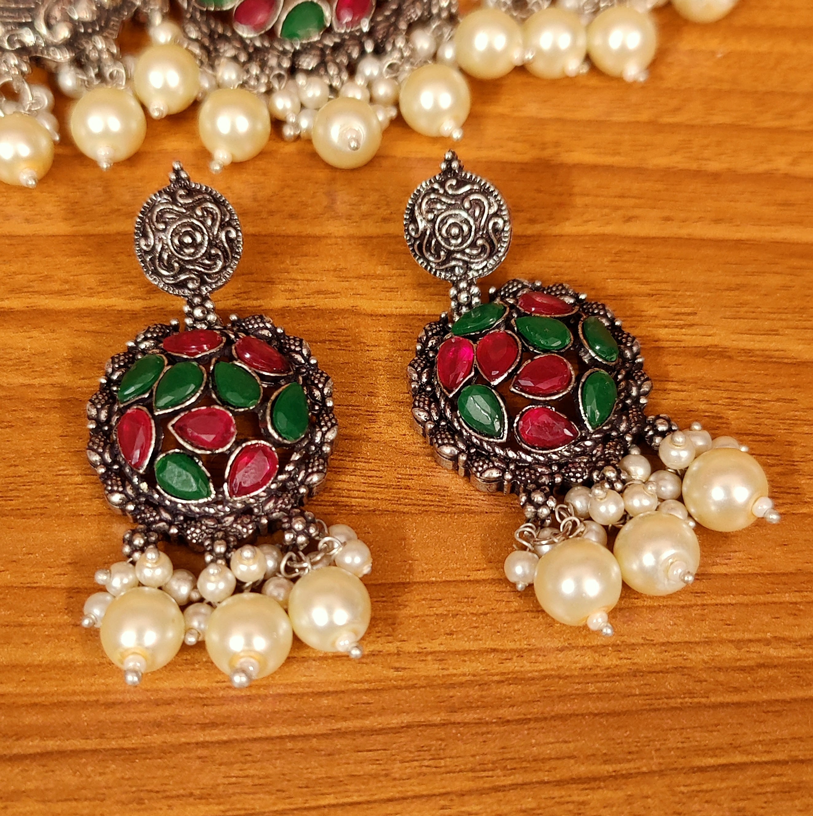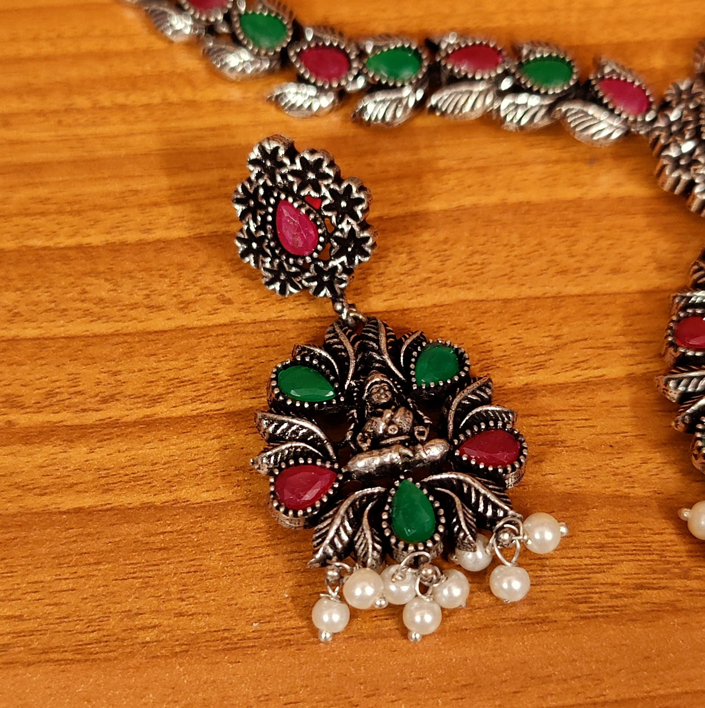 RED & GREEN COLOR STONE STUDDED OXIDISED SILVER NECKLACE SET