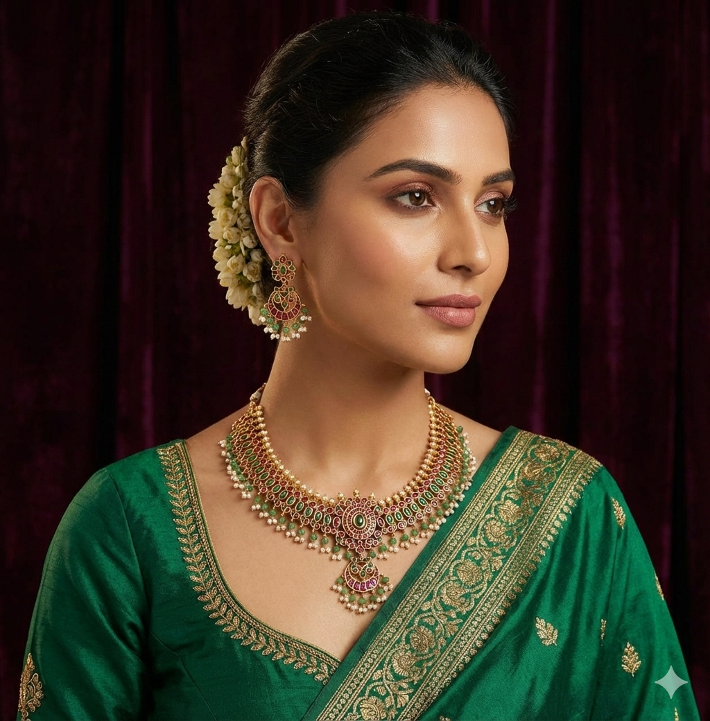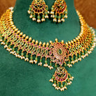 Step into regal elegance with the Royal Ruby & Emerald Pearl Necklace Set . Crafted in a stunning gold-tone lattice design, this set features rich emerald green stones, sparkling high-grade cubic zirconia (CZ), and delicate pearl drop detailing that creates a majestic bridal statement.
