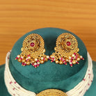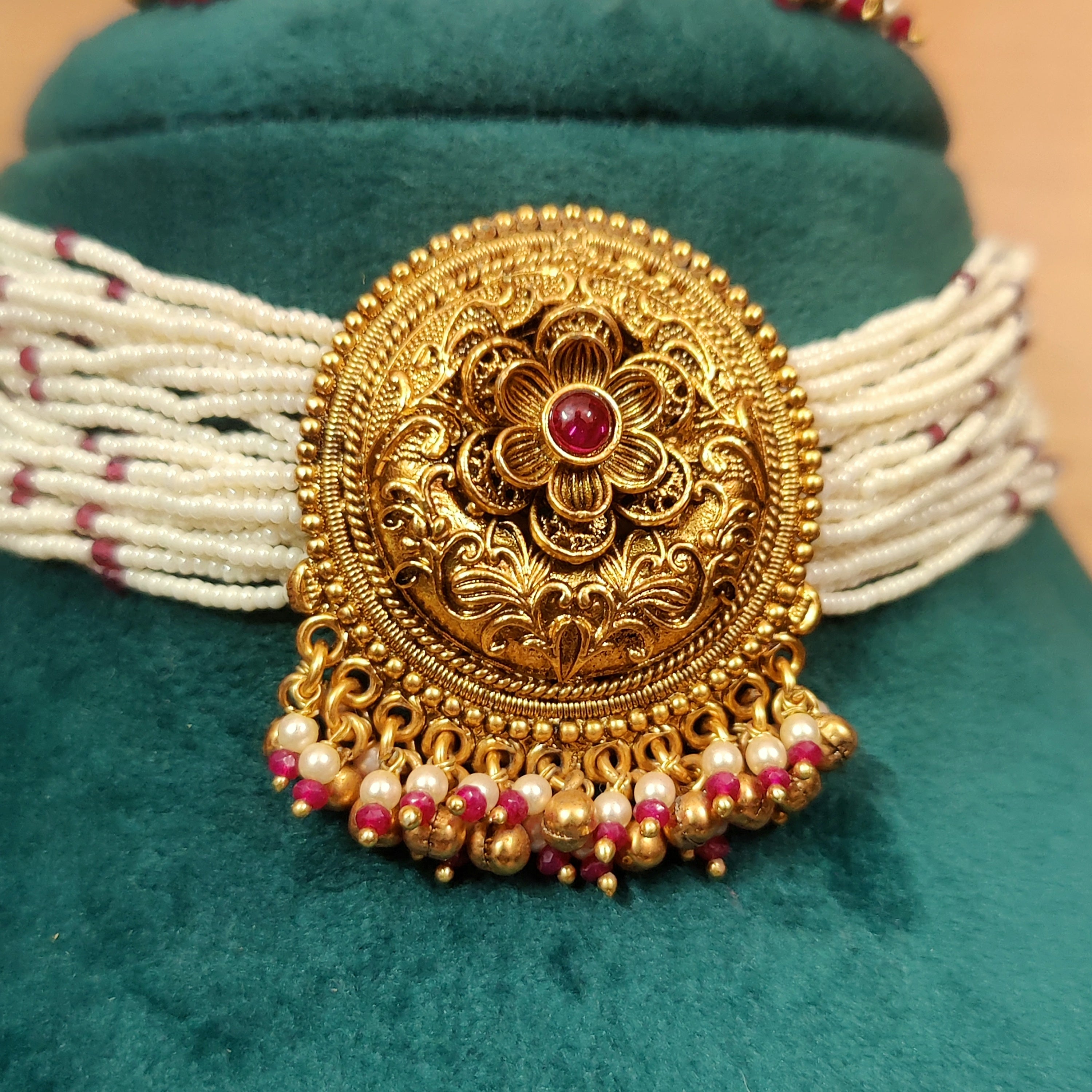 ANTIQUE GOLD PLATED RUBY KEMPU STONE PEARL CHOKER SET
