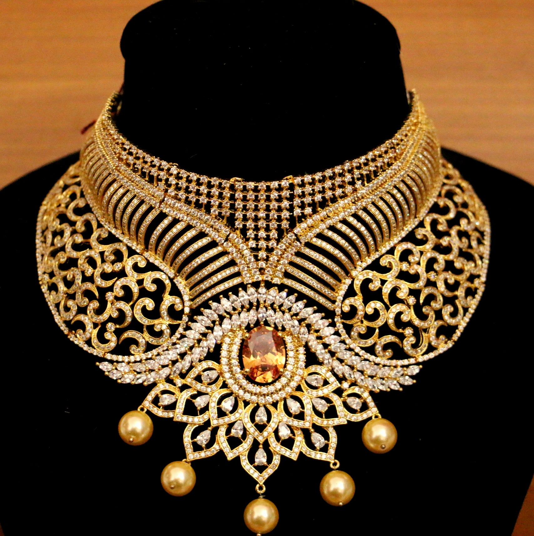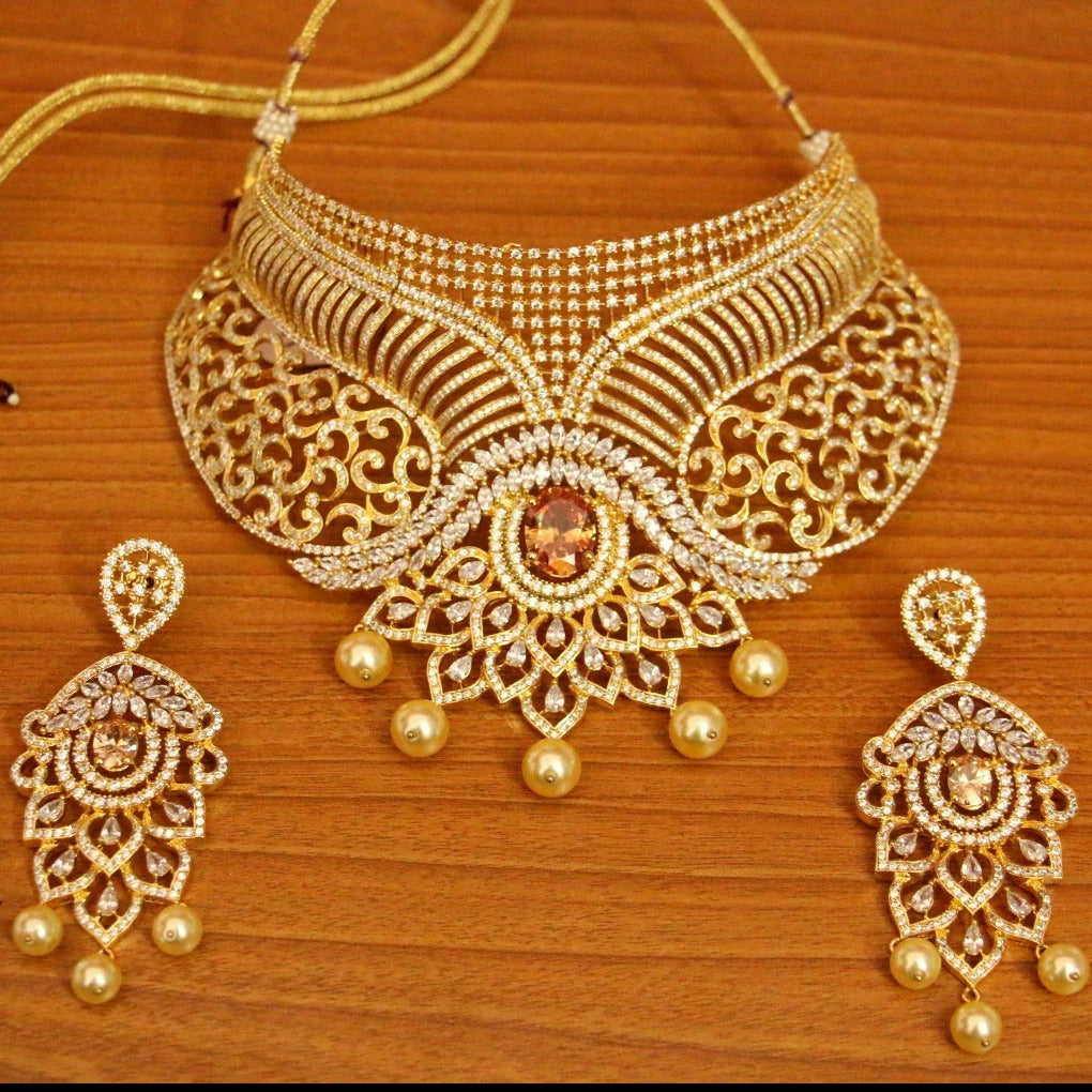 This gold diamond look necklace set is handcrafted in silver alloy with imitation pearls, citrine & cz stones of very fine quality , the necklace set plated with 18kt gold rhodium to give it a real gold look.