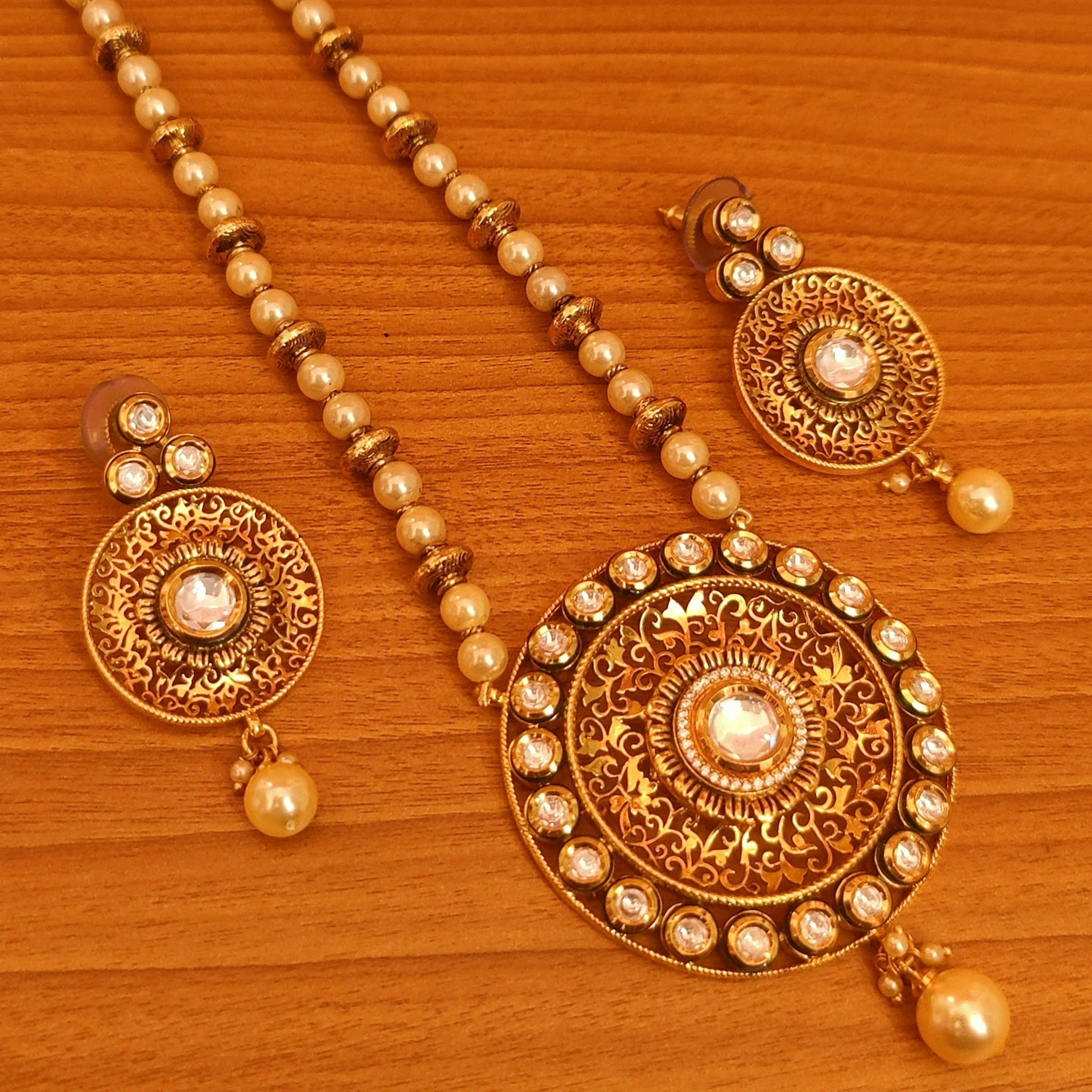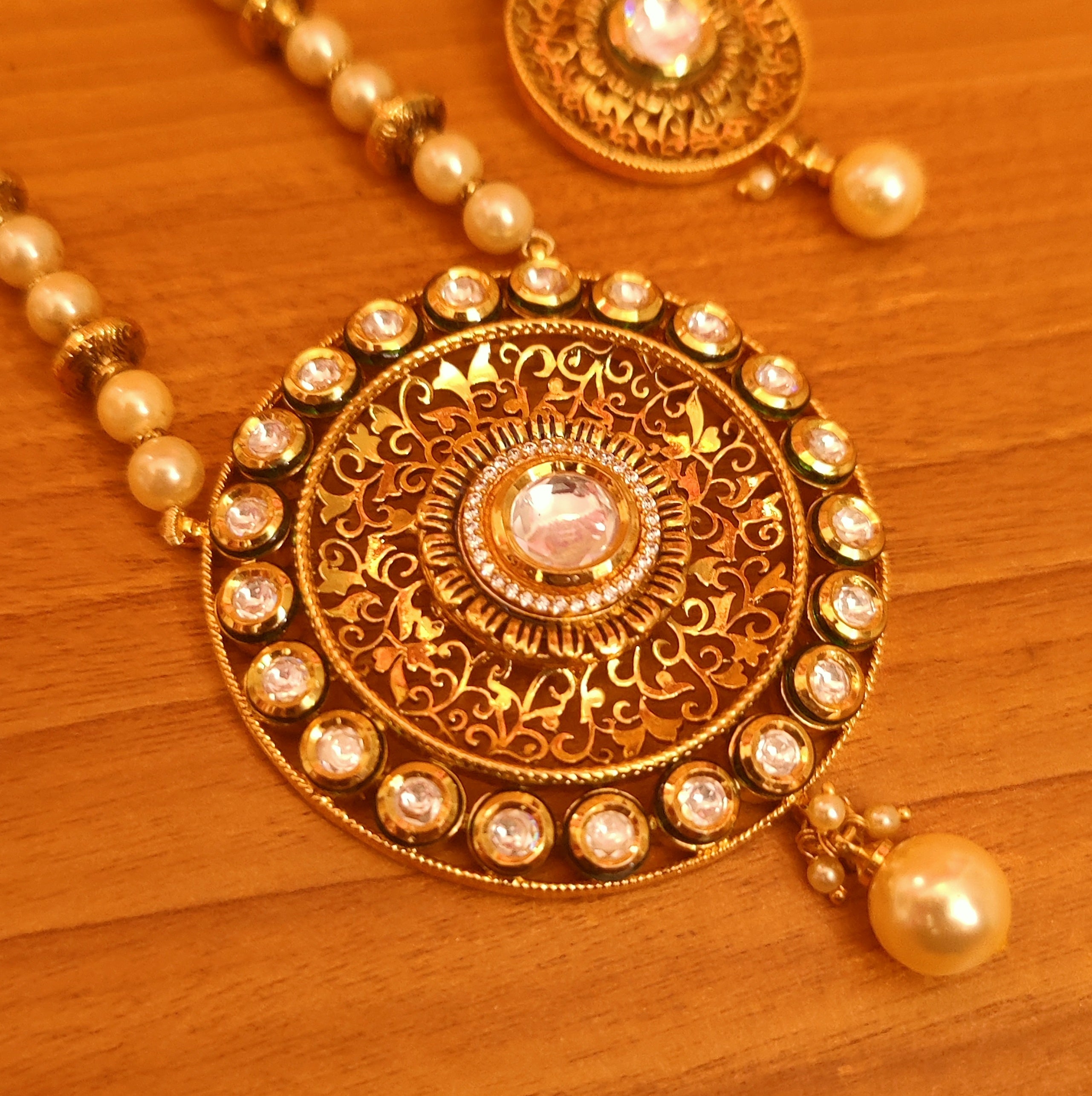 ANTIQUE GOLD LOOK KUNDAN POLKI & PEARL PENDANT SET